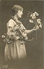 long haired girl in ragged dress stands facing right looking down at flowers held in her left hand, flowers cradled in right arm