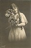 long haired girl in ragged dress stands facing & looking front, flowers held to right shoulder with both hands, looks front