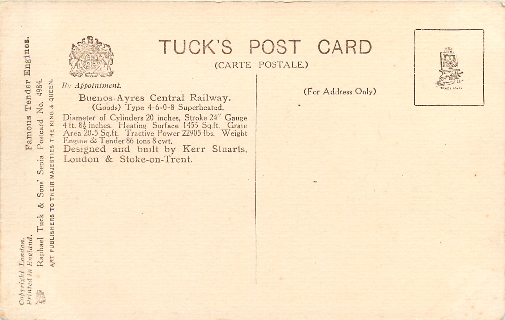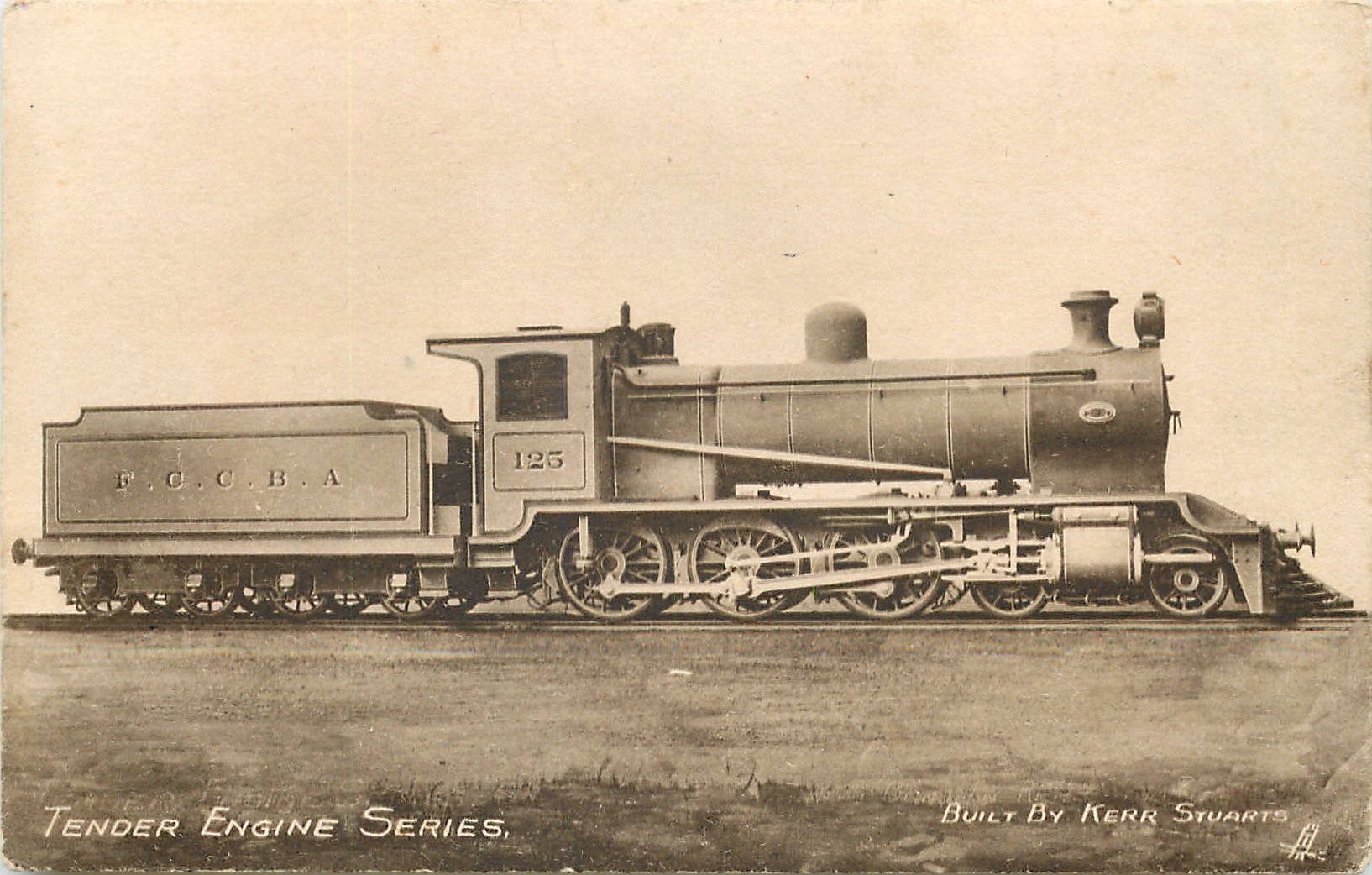 SEPIA, PRINTED IN ENGLAND, COPYRIGHT LONDON, come TENDER ENGINE SERIES BUILT BY KERR STUARTS front