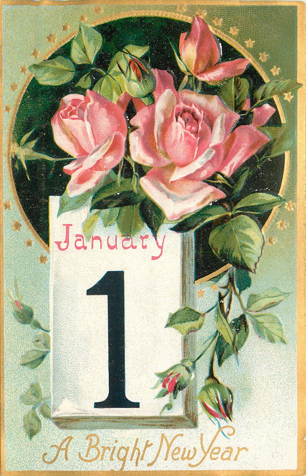 A BRIGHT NEW YEAR calendar to left, pink roses above