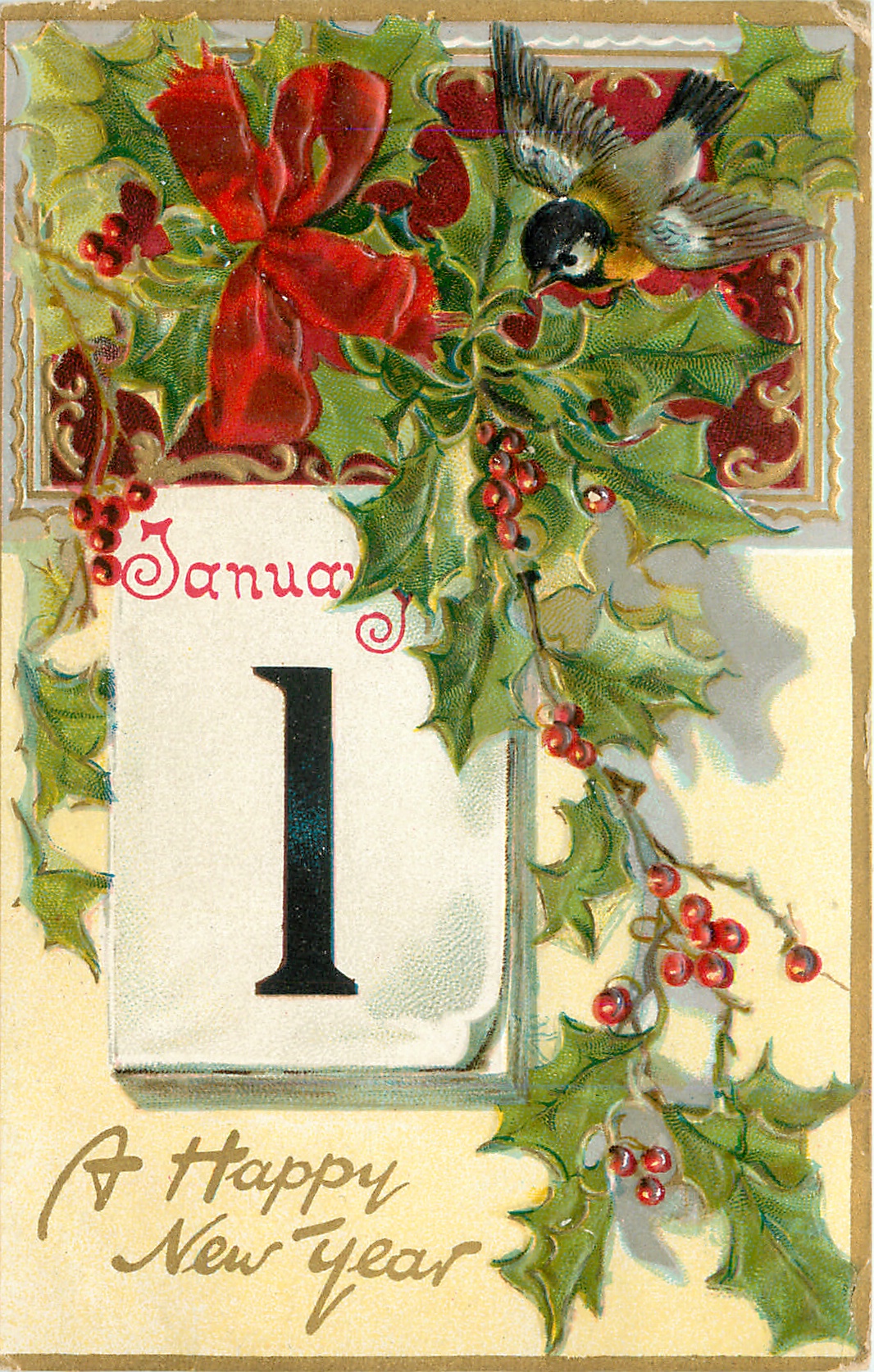 A HAPPY NEW YEAR bird in flight upper right, calendar left center, bow upper left