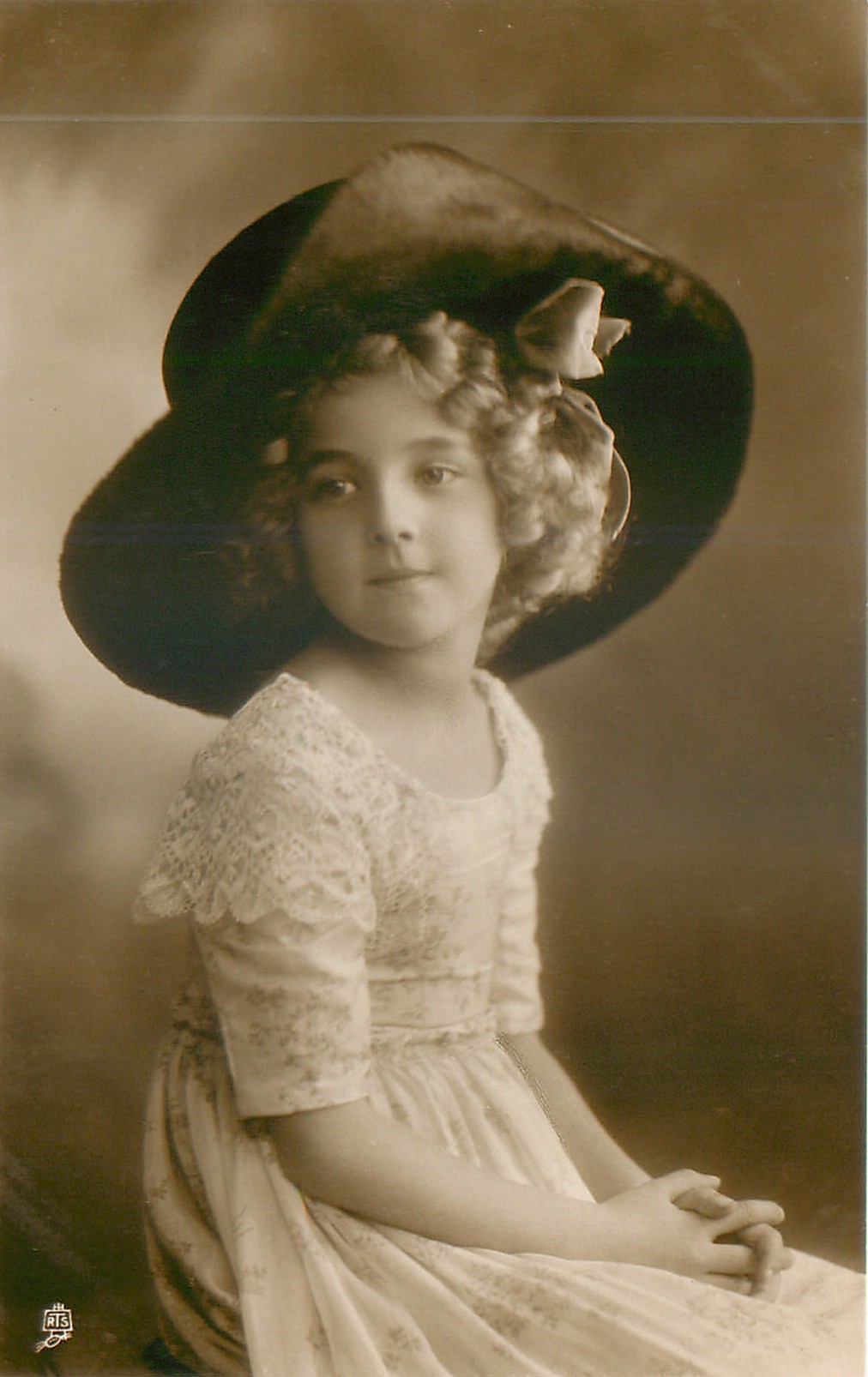 portrait of girl in white dress and very large hat, body faces right, head straight, eyes look to her right