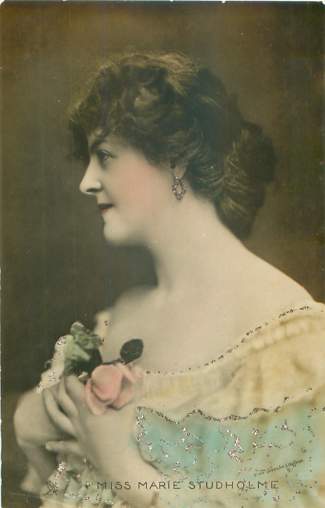 JOHNSTON & HOFFMAN, head & shoulders, facing front/left, low neck dress , holds rose to her chest,, looks left, hand-coloured & glittered, same image P156