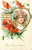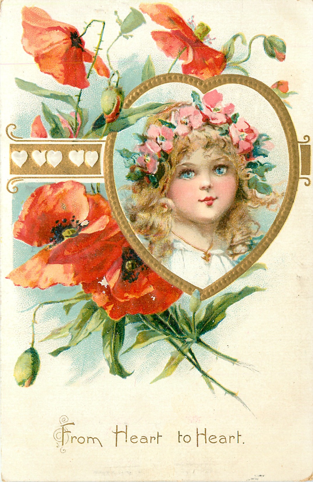 FROM HEART TO HEART girls face inset in gilt heart, red poppies