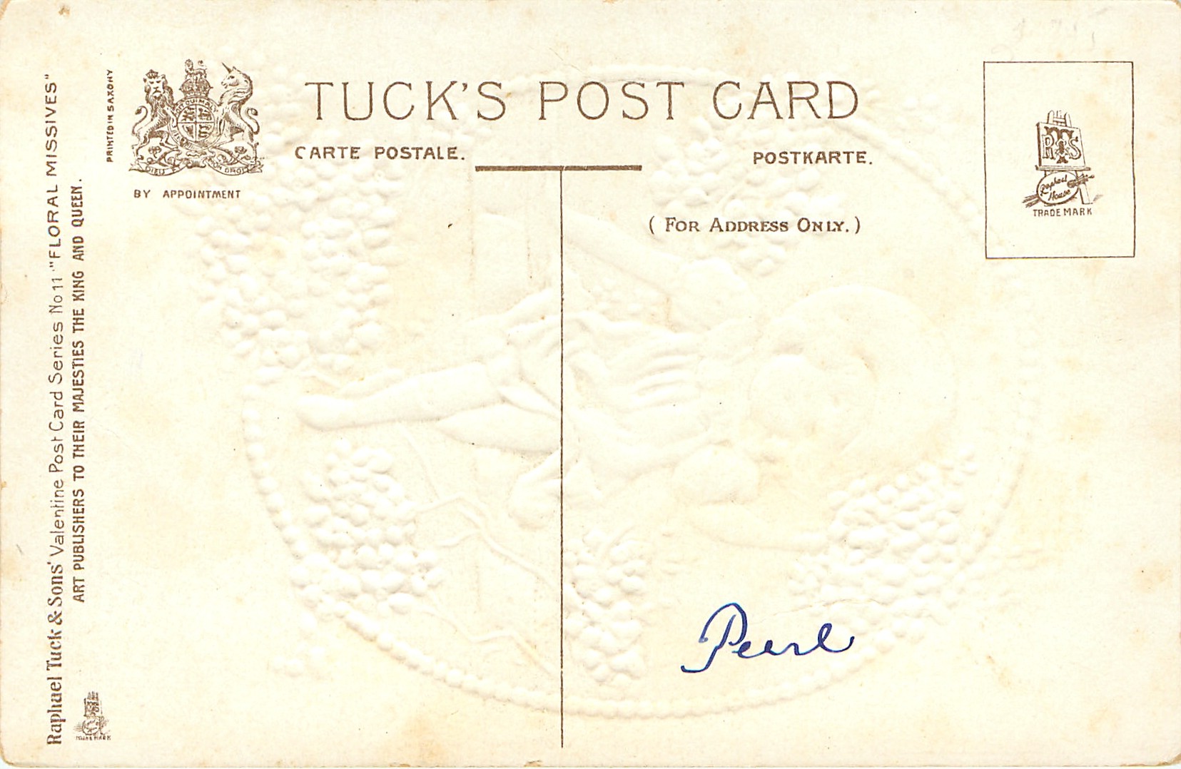 gilt embossed, PRINTED IN SAXONY, come glittered, a few identical designs occur with different wording-listed separately, many of these numbered cards also come unnumbered