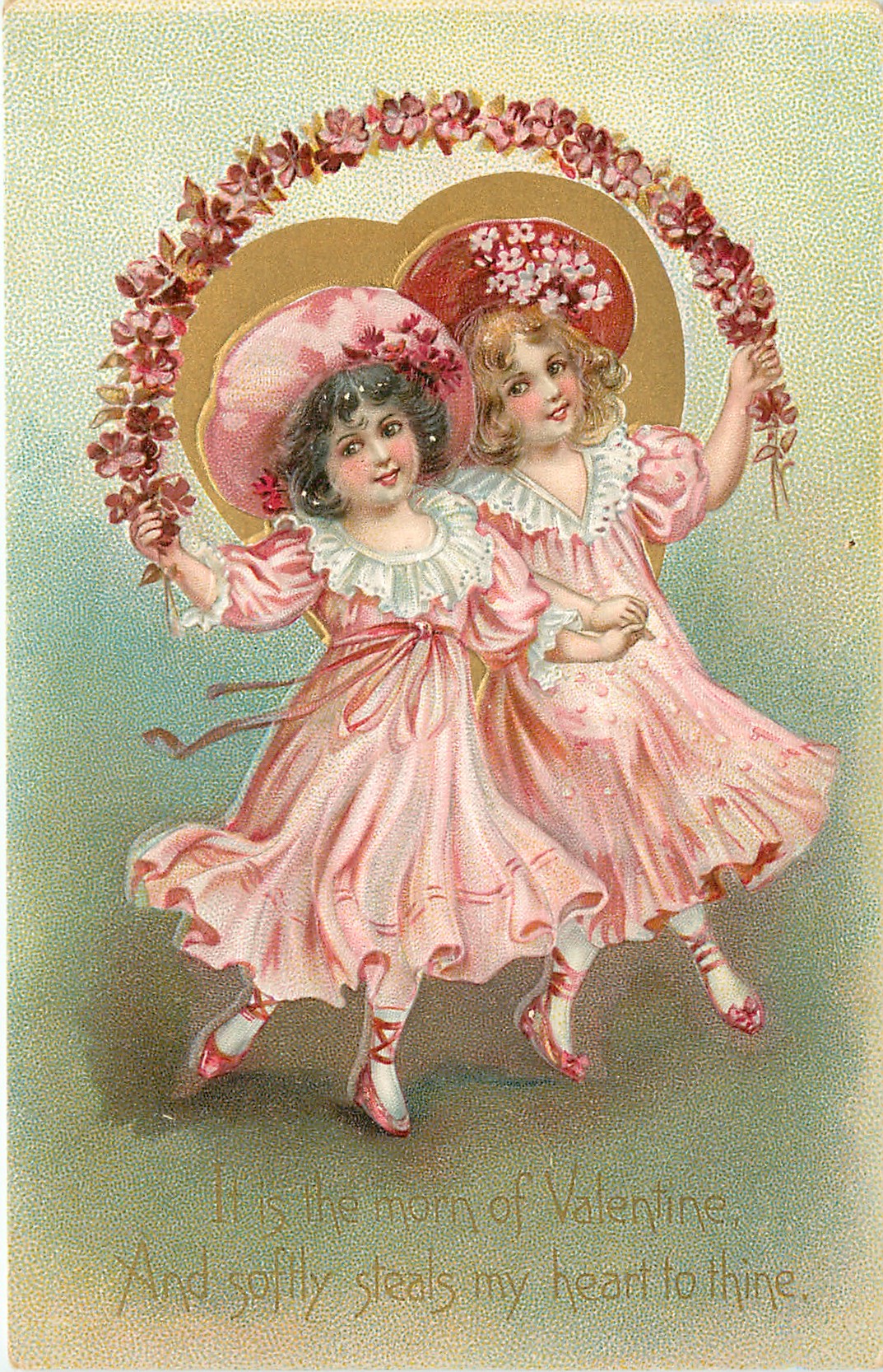IT IS THE MORN OF VALENTINE, AND SOFTLY STEALS MY HEART TO THINE two girls in red dance holding rope of red flowers image***