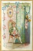 LOVE'S GREETING boy sits on chair with bouquet, girl peeks round door