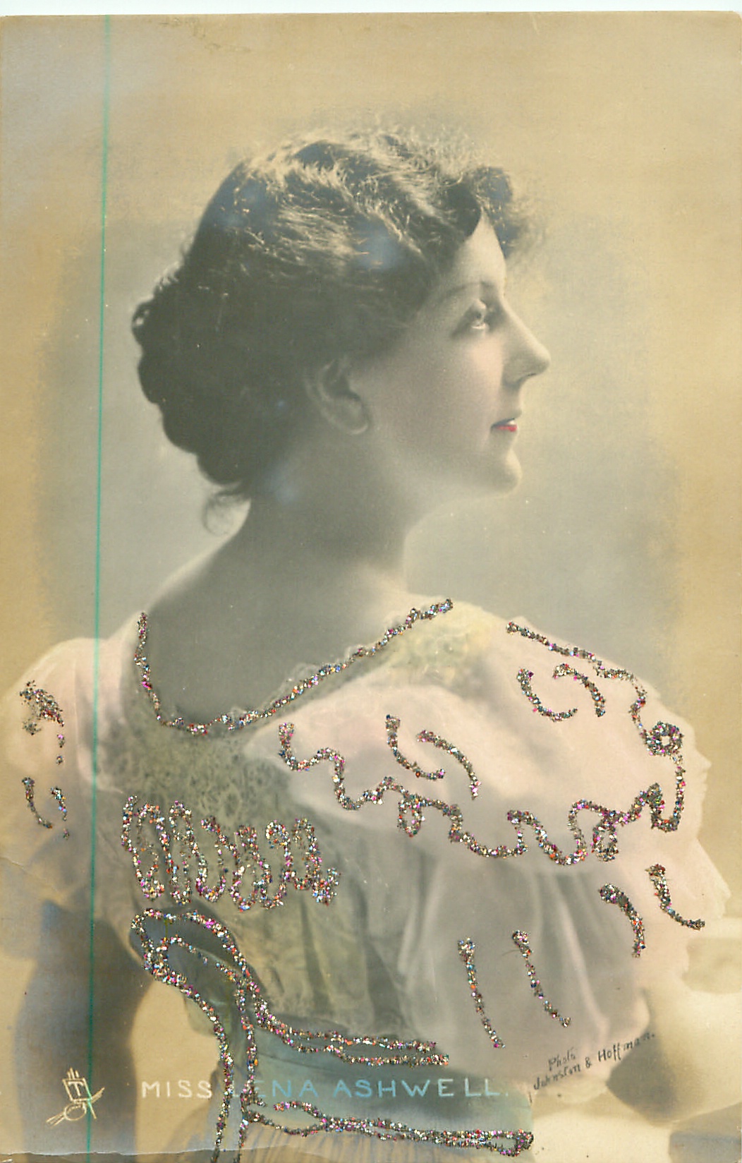 PHOTO JOHNSTON & HOFFMAN, hand-coloured, hand-coloured & glittered, same image G814 Lena Ashwell (1872 Eng.-1957 London.) Actress, Manager, Producer, Organized entertainment for front lines WWI, In "The Darlings of the Gods" His Majesty's Th. London 1903-04;