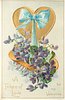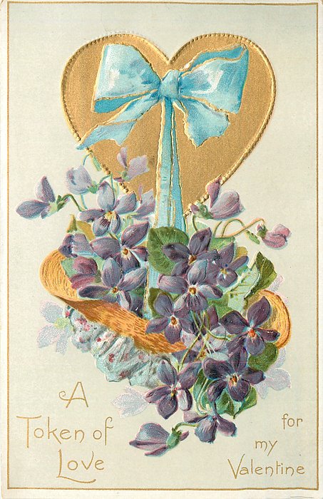 A TOKEN OF LOVE FOR MY VALENTINE hat full of violets suspended from gilt heart, by blue ribbon