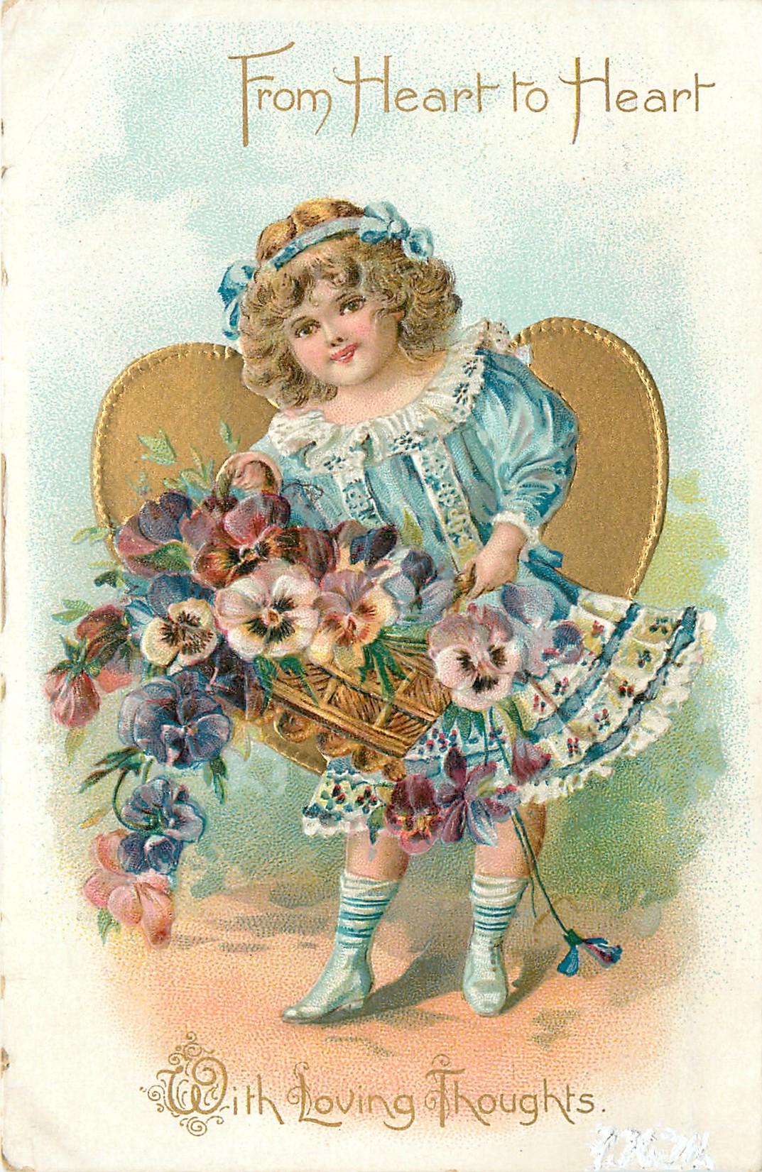 FROM HEART TO HEART WITH LOVING THOUGHTS girl with pansies in front of gilt heart