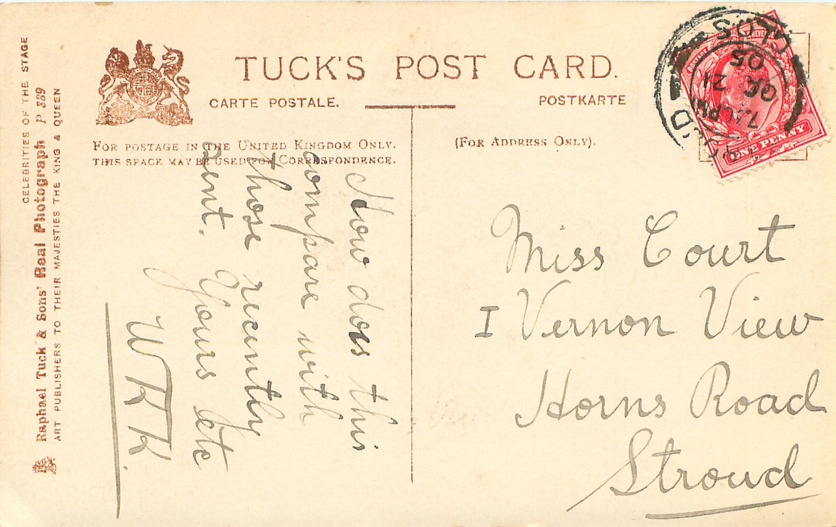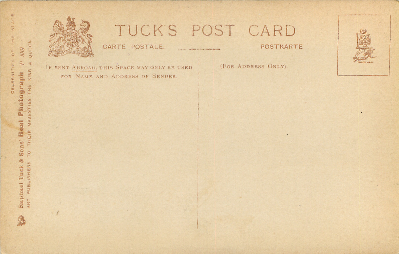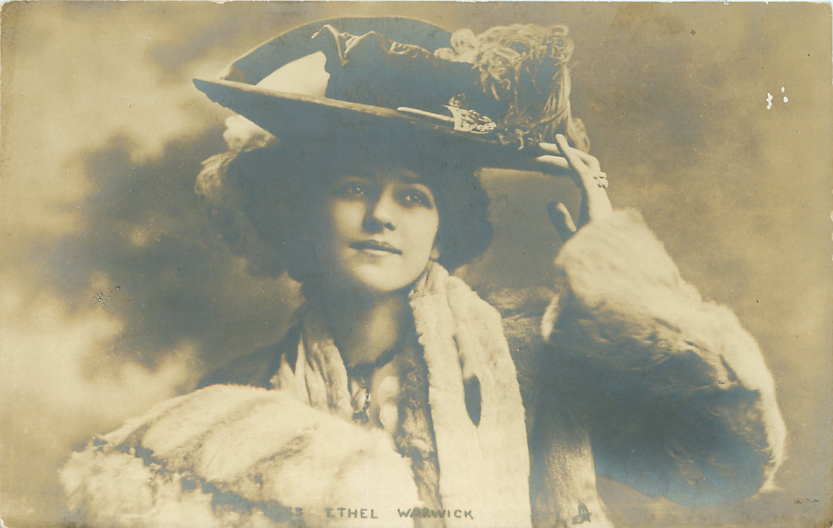 2 backs, hand-coloured & glittered Etthel Warwick (1882-1951) Ist Stage appearance as Emile in "The Corsican Brothers" Grand Th. Fulham; 1900; was nude model for artists including James M. Whistler;