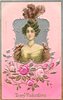 TO MY VALENTINE (pink background) girl in gold dress & ostrich feather hat, roses below