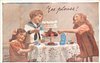 YES, PLEASE! three children eat round loaded tea-table, boy holds out tea-cup