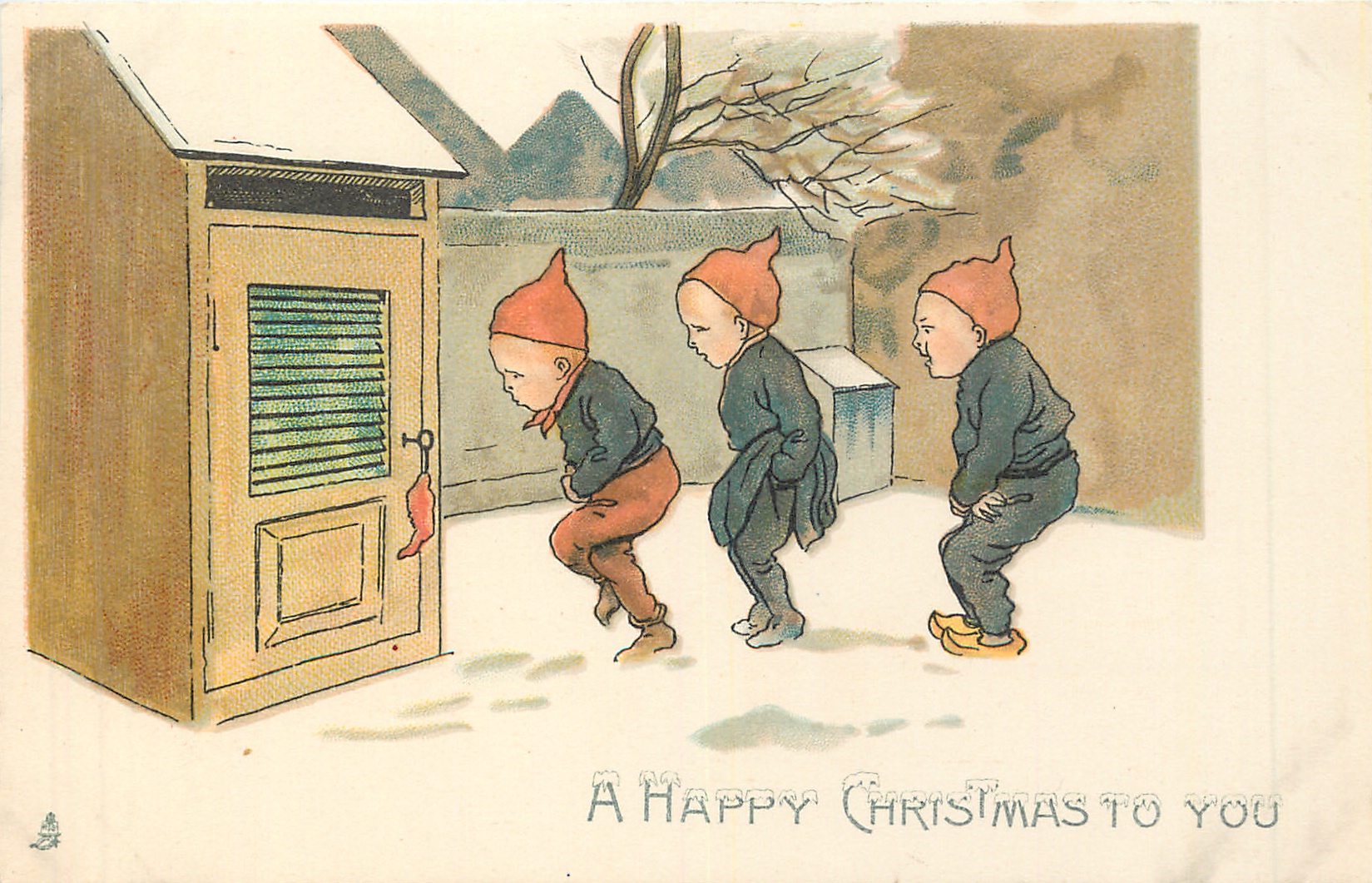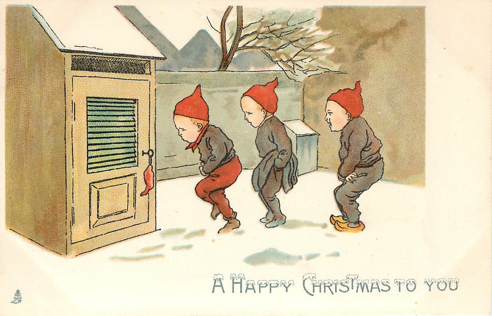A HAPPY CHRISTMAS TO YOU three dwarves line up in snow urgently waitng to use toilet