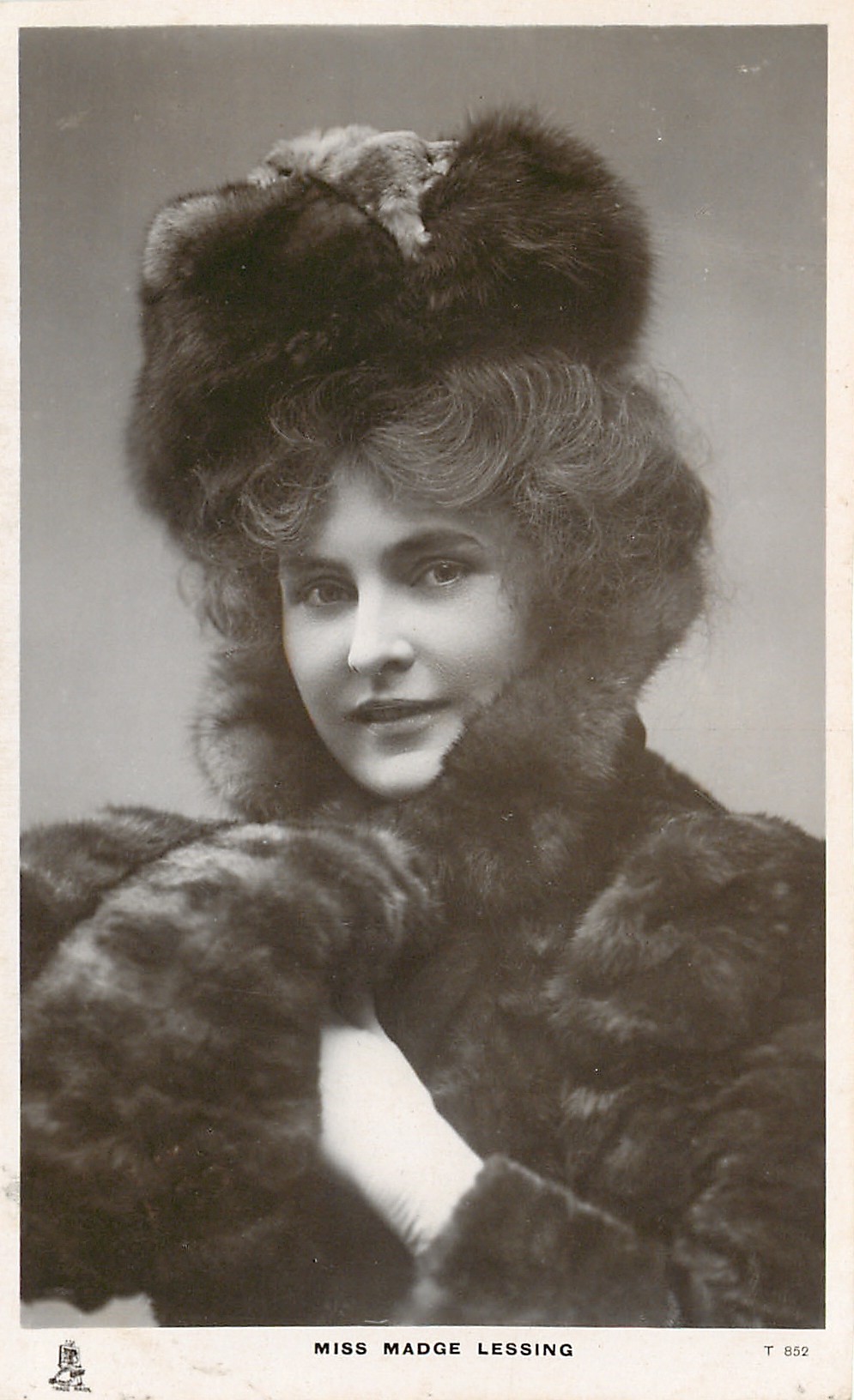 MISS MADGE LESSING wearing fur, left hand to right shoulder, looking front