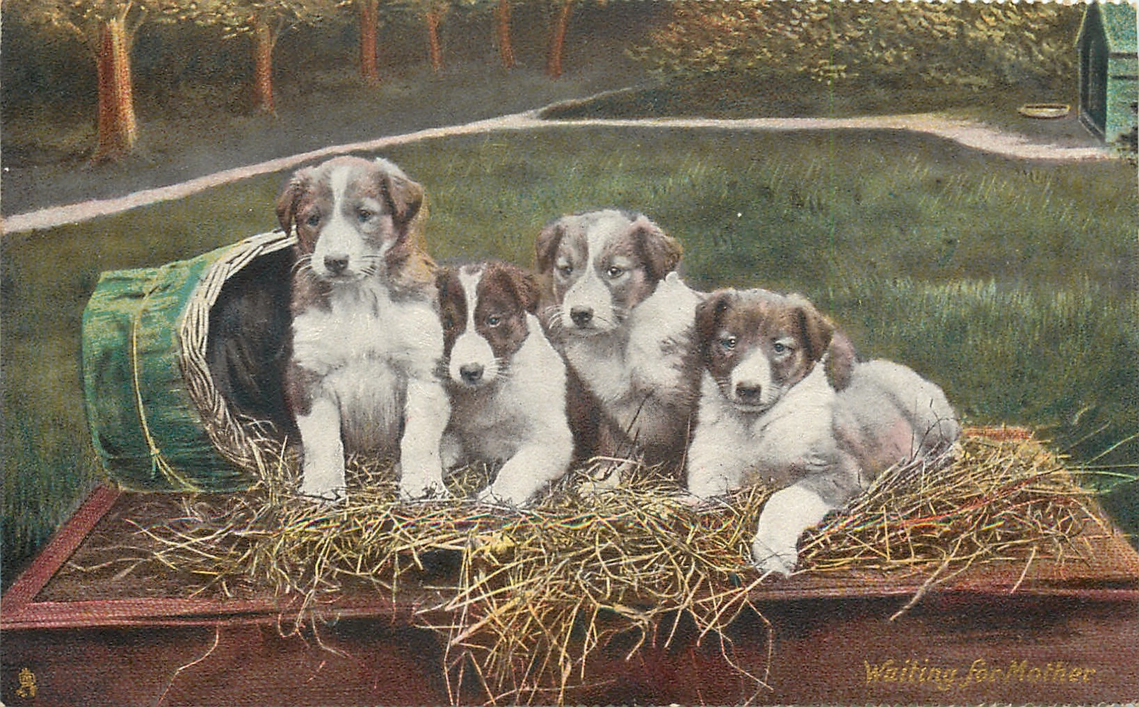 WAITING FOR MOTHER four puppies in hay
