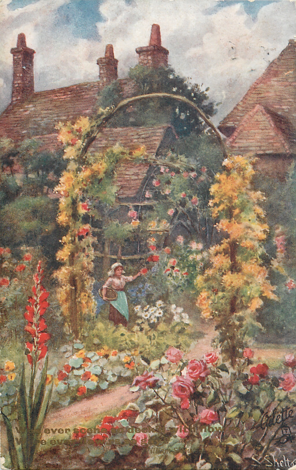 OILETTE CONNOISSEUR, PRINTED IN ENGLAND, come with & w/o garden related quotes, same images OILETTE or OILFCSIM 10055, listed in TUCK'S TRAVELOGUES (USA?1905)