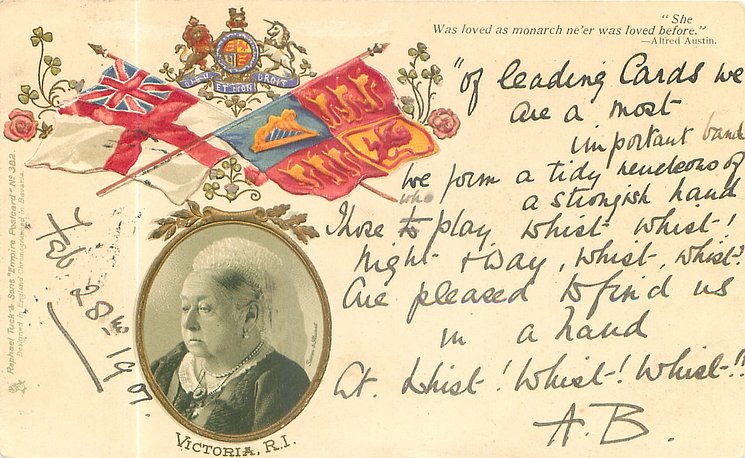 VICTORIA ,R.I., portrait looking left(GUNN & STEWART), SHE WAS LOVED AS MONARCH NE'ER WAS LOVED BEFORE-ALFRED AUSTIN same embossed card as before & in 383, 384, 384