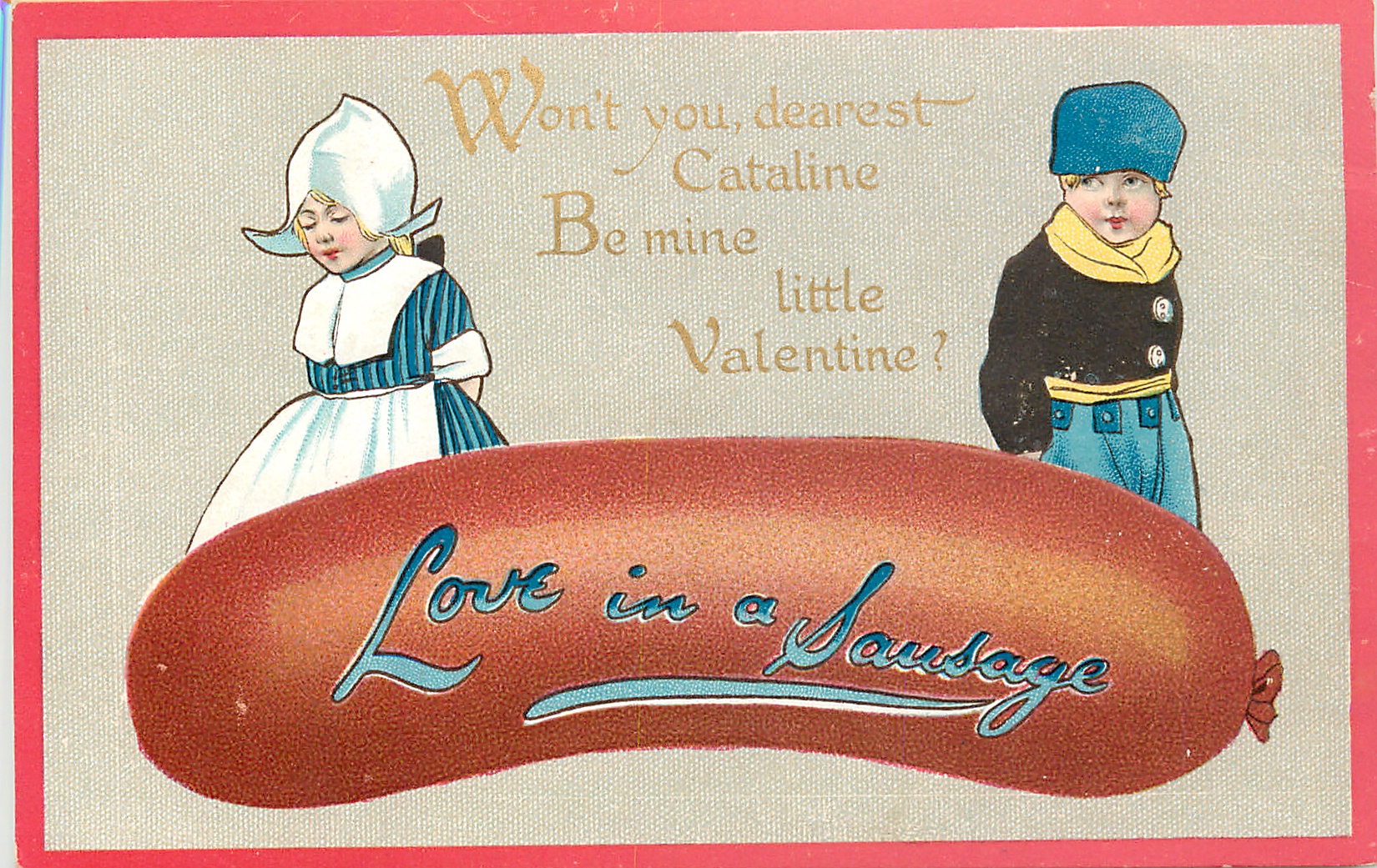 LOVE IN A SAUSAGE WON'T YOU DEAREST CATALINE BE MINE LITTLE VALENTINE?