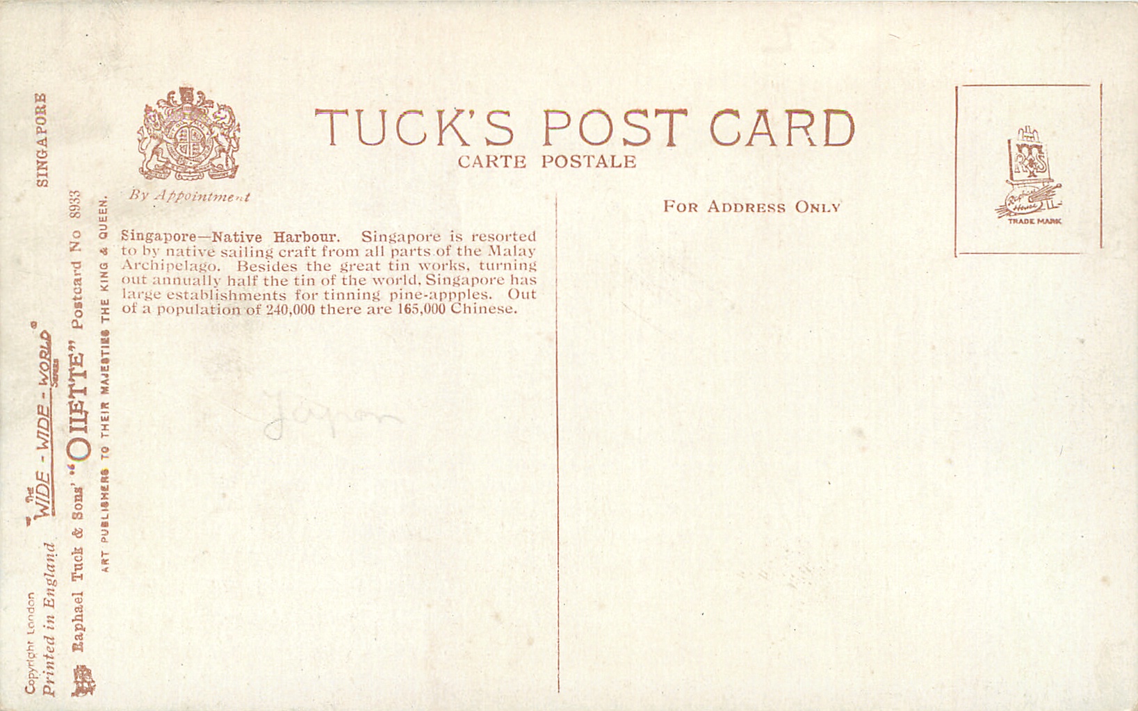 OILETTE, WIDE WIDE WORLD, PRINTED IN ENGLAND with or w/o COPYRIGHT LONDON, 2 backs, listed in 1930 POSTCARD Catalogue