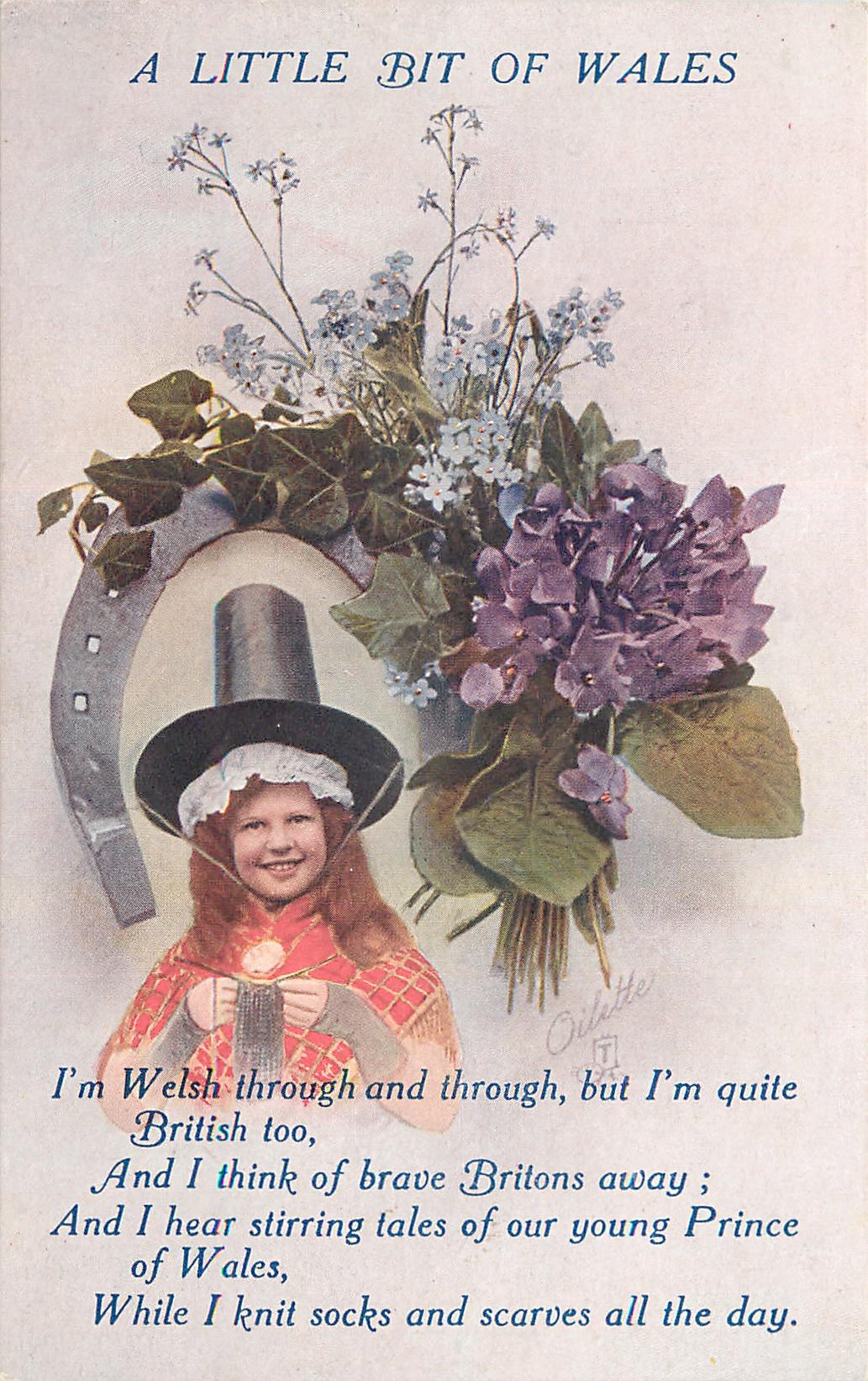 A LITTLE BIT OF WALES I'M WELSH THROUGH AND THROUH, BUT I'M QUITE BRITISH TOO, AND I THINK OF BRAVE BRITAINS AWAY/THE DAY welsh girl under horseshoe & flowers