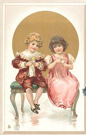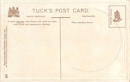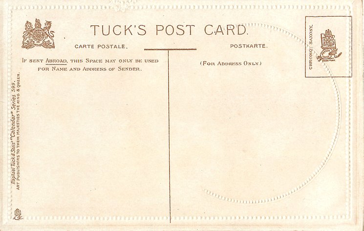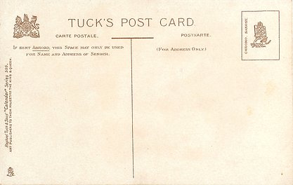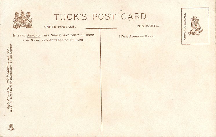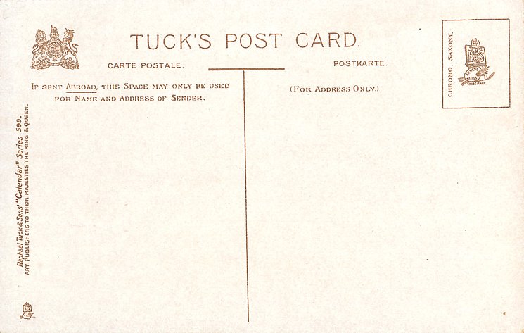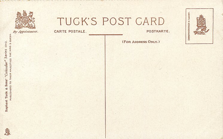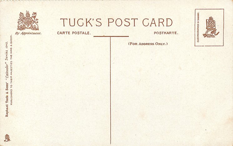 CHROMOGRAPHED IN SAXONY, come RAPHAEL TUCK & SONS CO. LTD, LONDON, PARIS, NEW YORK, DESIGNED IN ENGLAND, PRINTED IN SAXONY, cards with perforations top & bottom from 1905 calendar