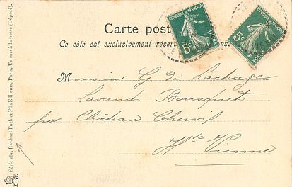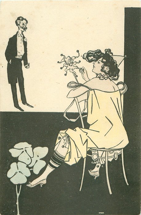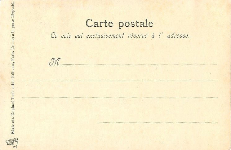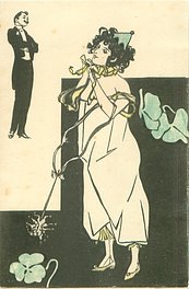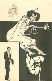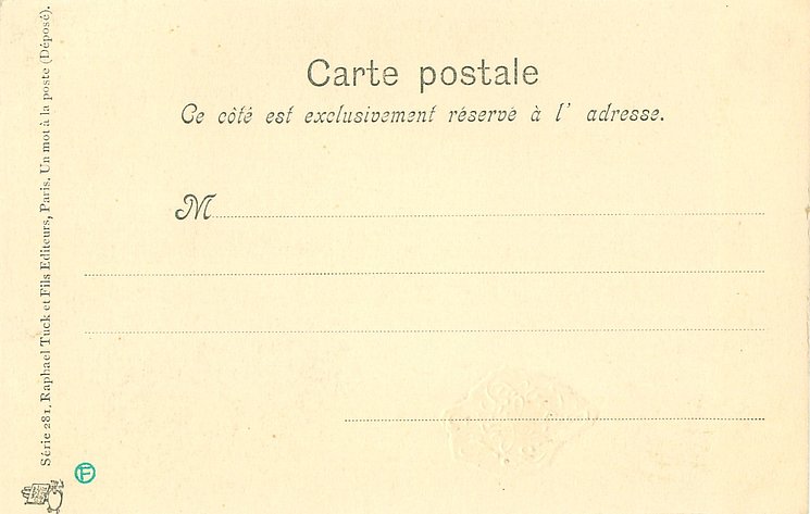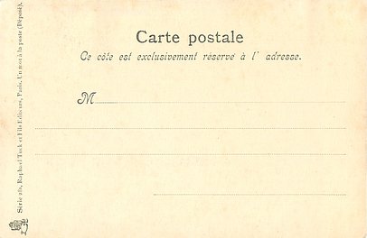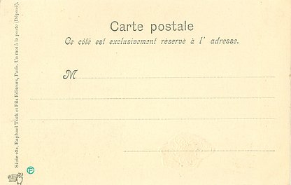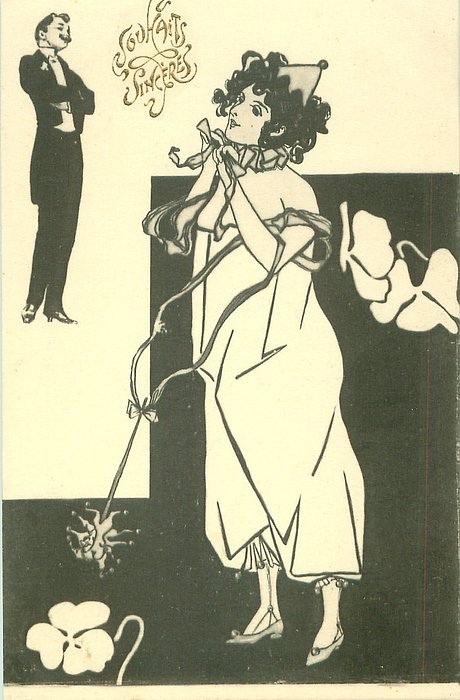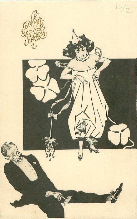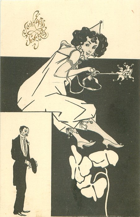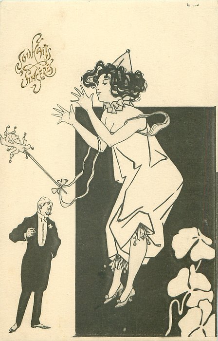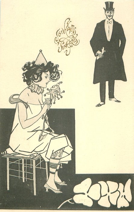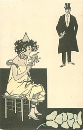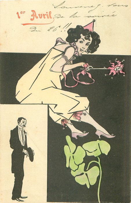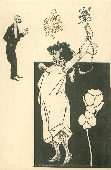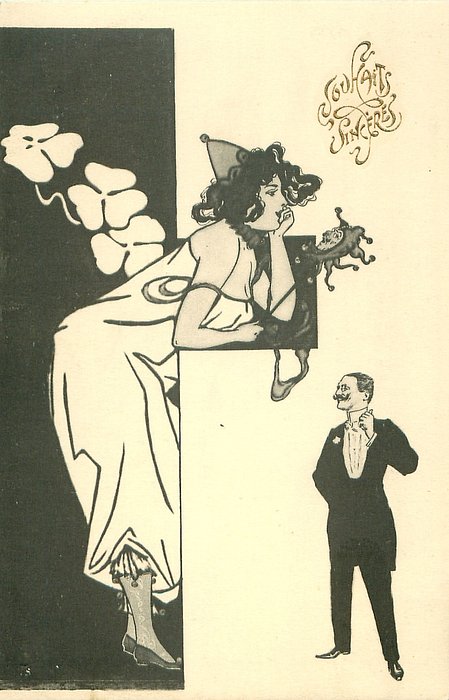 u/b, black & white, come hand-coloured, UN MOT A LA POSTE, (DEPOSE), come gilt embossed SOUHATS SINCERES or 1 ER APRIL, come opt. in red on back LA PLUS IMPORTANTE SPECIALITE DE PAPIER A LETTRES COQUEMER, GRAVEUR, IMPRIMATEUR, 10, RUE BAYEN, PARIS, come opt. in purple on front BAL TABARIN