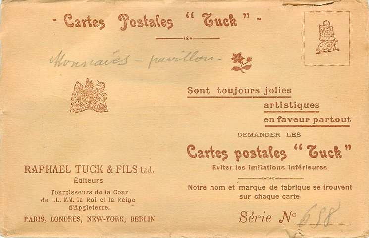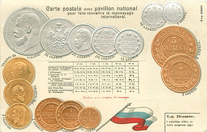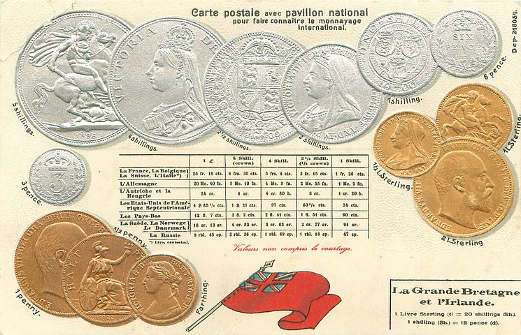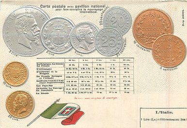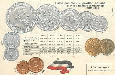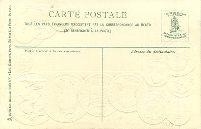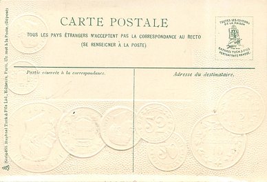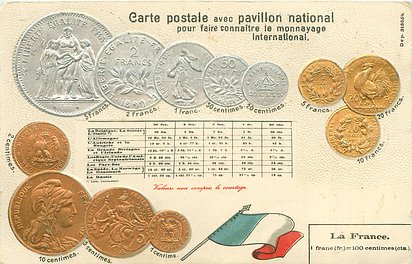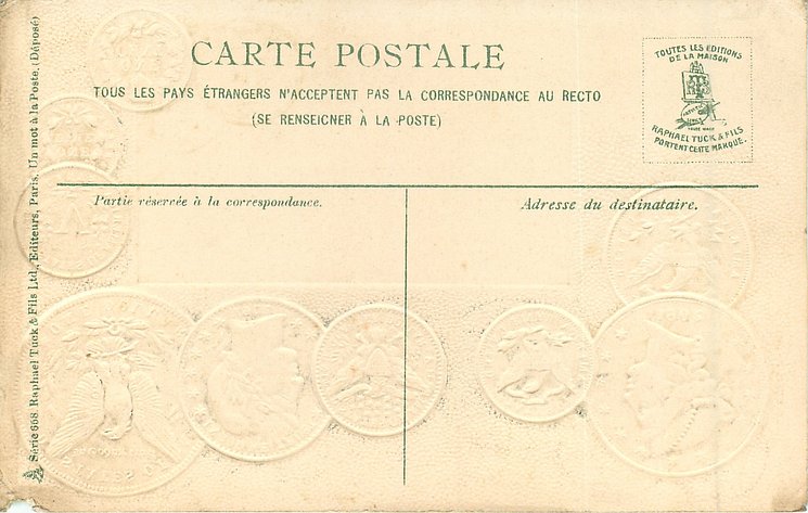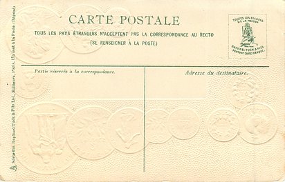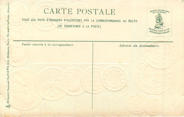 green backs, UN MOT A LA POSTE, (DEPOSE), gilt & silver embossed, come POUR FAIRE CONNAITRE LE MONEYAGE INTERNATIONAL, Zeiher type of coin card numbers upper right corner