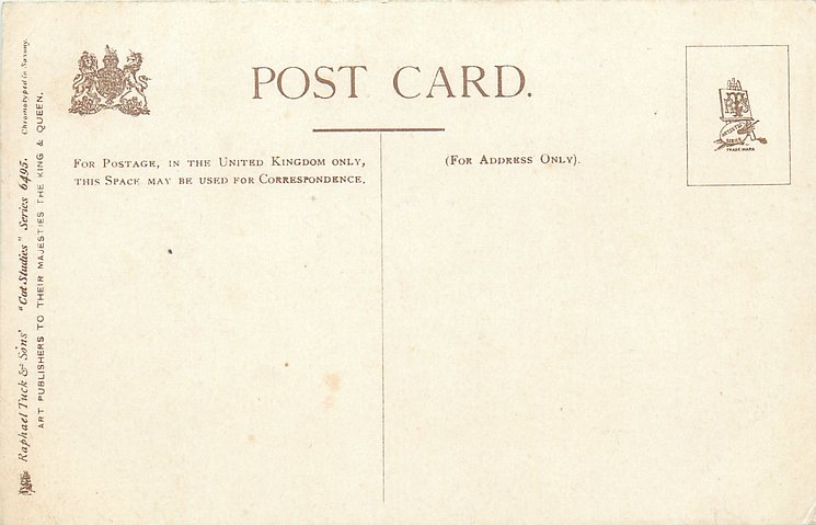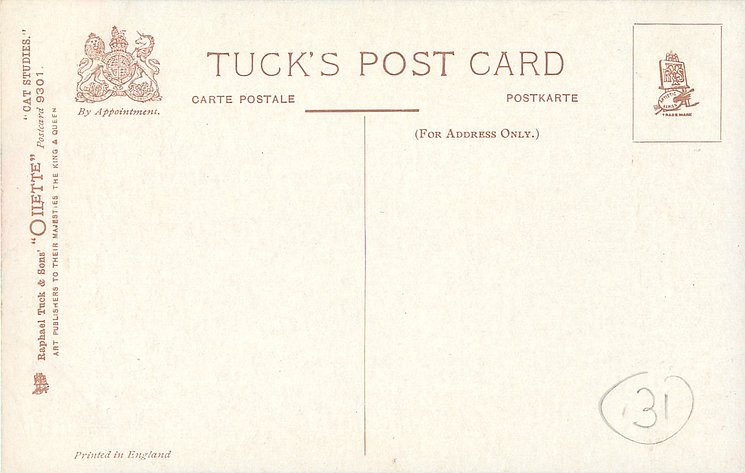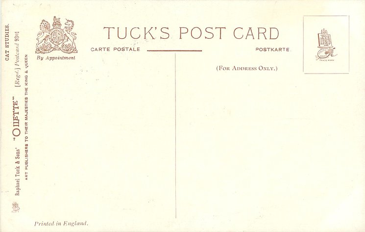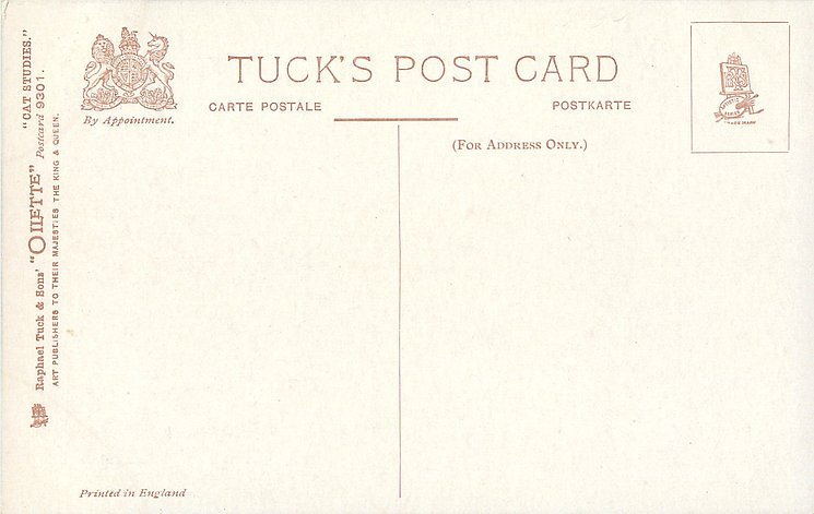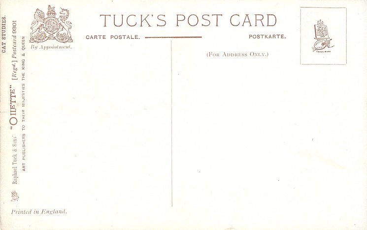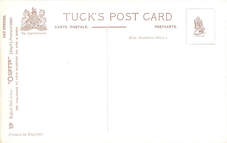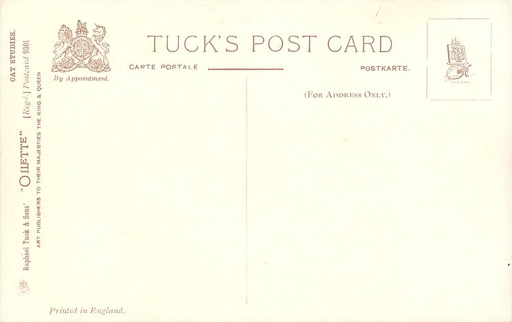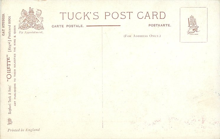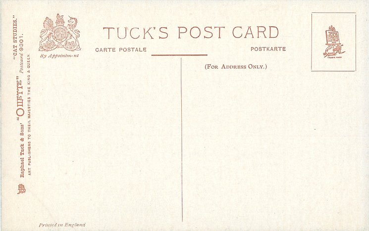 OILETTE, PRINTED IN ENGLAND, listed in 1908/1909 & 1911/1912 & 1912/1913 POSTCARD Catalogue as PUSSY IN FAIRYLAND & as CAT STUDIES