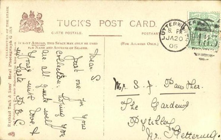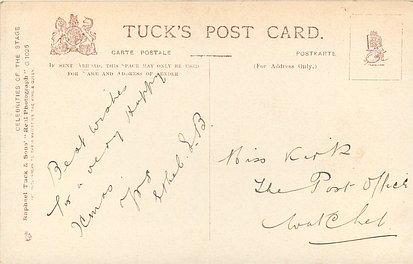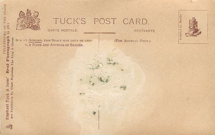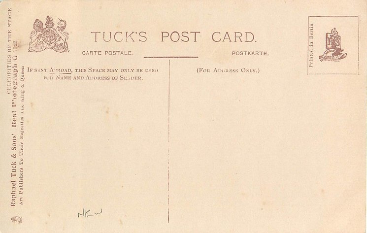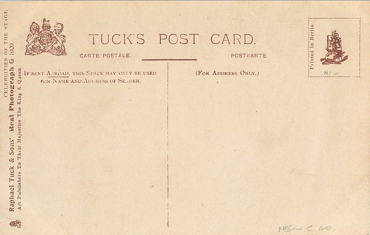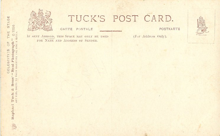 REAL PHOTOGRAPH, come hand coloured and with glitter. Cards in this set have prefix G and number on back or front of card. Cards with number and suffix G on front are recorded in set CELEBRITIES OF THE STAGE (i.n. 1000-1149G) .
