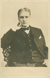 as Sherlock Holmes, 2/3 study, hand under chin Playwright, Director, Actor .In 1895 wrote & starred in "Secret Service" Broad St .Th. Philadelphia., then Garrick's Th. 1896; Ethel Barrymore had small part .Adelphi Th. & Duke of York Th.1902 Revived often "Sherlock Holmes" 1899 Garrick Th.(236).