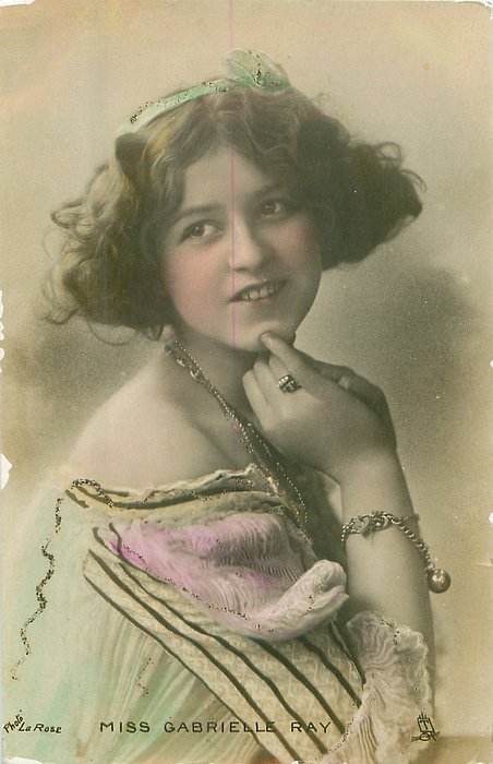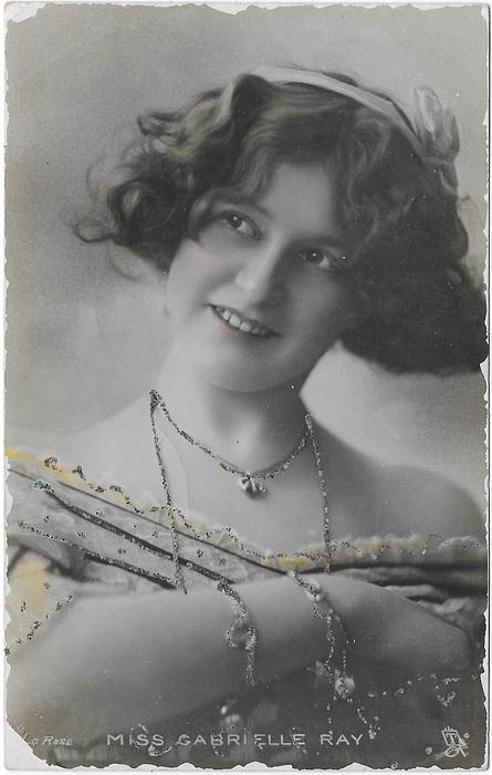 hand-coloured & glittered, hand-coloured & beaded, same image P980, PHOTO LA ROSE Gabrielle Ray. In 1912 retired to Marry Eric Loder. that lasted only 2 yrs. Then George Edwards died.. She was Estella in "Betty" at Daly's Th. London.1915 . Depression and Alchoholism brought about a complete breakdown.
