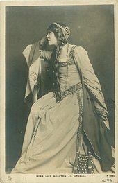 standing facing left her right hand on head Lily Brayton (1876 Eng.-1953 Eng.) as Ophelia in Hamlet 1905 her husband Oscar Asche was KIng in Hamlet.