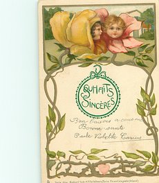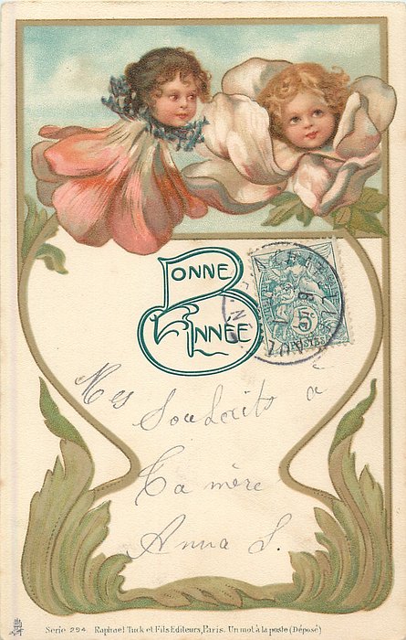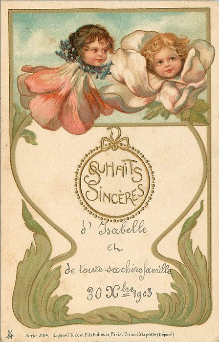comes opt. BONNE FETE or in green BONNE ANNEE, or SUHAITS SINCERES in gilt in circular design above iD"ISABELLE EH DE TOUTE SACHERE FAMILLE 30X BRELGOS