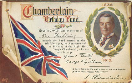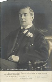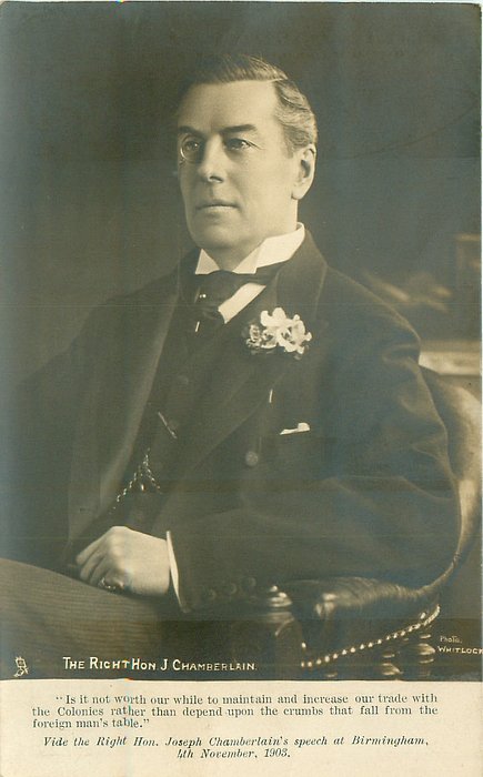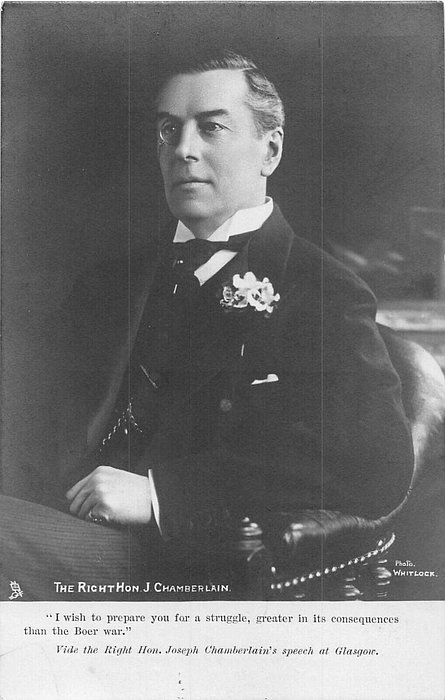 quote:- "IS IT NOT WORTH OUR WHILE TO MAINTAIN AND INCREASE OUR TRADE WITH THE COLONIES RATHER THAN DEPEND UPON THE CRUMBS THAT FALL FROM THE FOREIGN MAN'S TABLE." or "CIRCUMSTANCES HAVE CHANGED, AND WE SHOULD BE STUPID IF WE DID NOT CHANGE TO MEET THEM." or I WISH TO PREPARE YOU FOR A STRUGGLE, GREATER IN IT'S CONSEQUENCES THAN THE BOER WAR