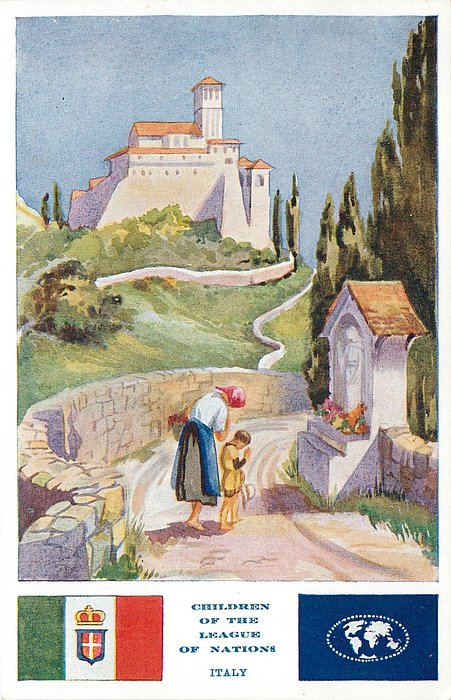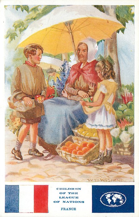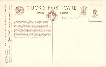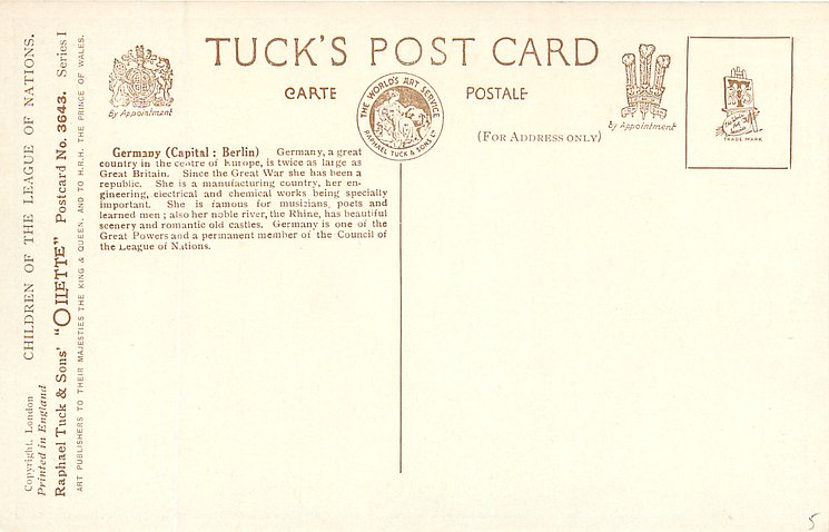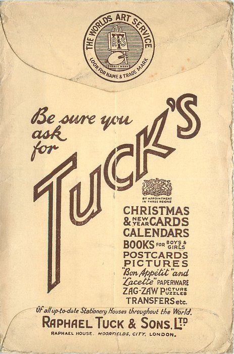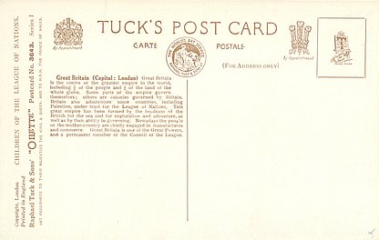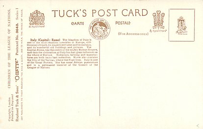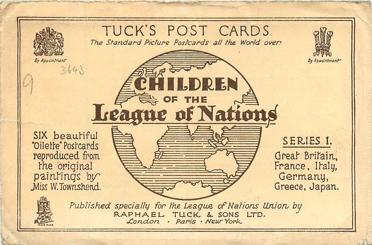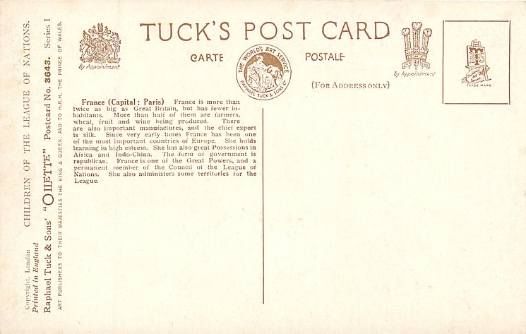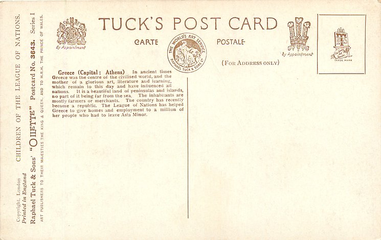 OILETTE, PRINTED IN ENGLAND, COPYRIGHT LONDON, SERIES 1. GREAT BRITAIN, FRANCE, ITALY, GERMANY, GREECE, JAPAN on packet, listed in 1930 POSTCARD Catalogue