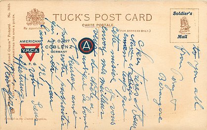 "COLORED CRAYON" POSTCARD, PRINTED IN THE UNITED KINGDOM, COPYRIGHT LONDON, comes opt on back AMERICAN Y.M.C.A. @ COBLENZ, GERMANY, SOLDIER'S MAIL, same images with New Year greetings N7669 & 1619