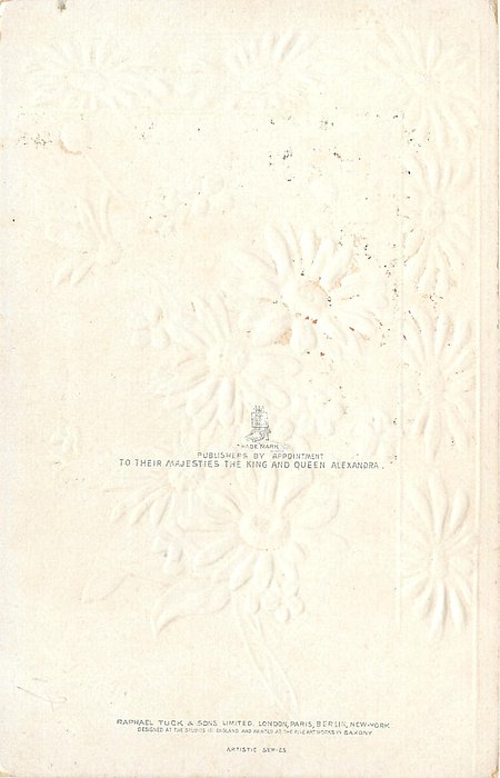 comes verse: LET THESE PICTURED FLOWERS- DARLINGS OF THE SPRING CHEER YOUR FUTURE HOURS, WITH THE THOUGTS THEY BRING, LET THEM WHISPER THIS GLAD DAY THE KINDLY WISHES I WOULD SAY.