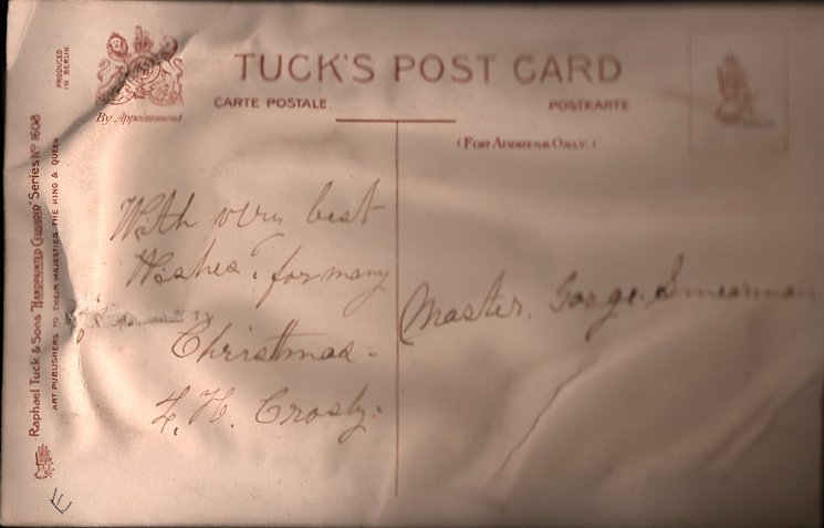 verse:- WITH MY GREETING MY BEST WISHES GO, MAY YULE ITS CHOICEST GIFTS ON YOU BESTOW'.