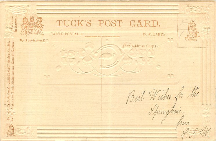 embossed, gilt in design, CHROMOGRAPHED IN BERLIN, listed in RAPHAEL TUCK & SONS' LD. CHRISTMAS & NEW YEAR 1904/1905 catalogue