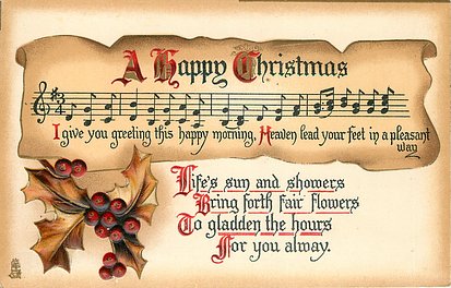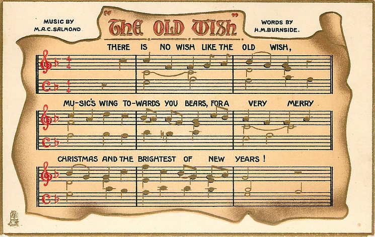 musical verse: THERE IS NO WISH LIKE THE OLD WISH, MUSIC'S WING TO-WARD YOU BEARS, FOR A VERY MERRY CHRISTMAS AND THE BRIGHTEST OF NEW YEARS!, MUSIC BY M.A.C. SALMOND WORDS BY H.M. BURNSIDE
