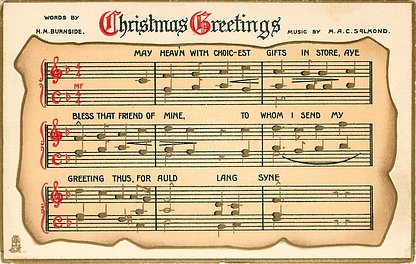 musical verse: MAY HEAV' N WITH CHOICEST GIFTS IN STORE, AYE BLESS THAT FRIEND OF MINE, TO WHOM I SEND MY GREETINGS THUS, FOR AULD LANG SYNE, MUSIC BY M.A.C. SALMOND WORDS BY H.M. BURNSIDE
