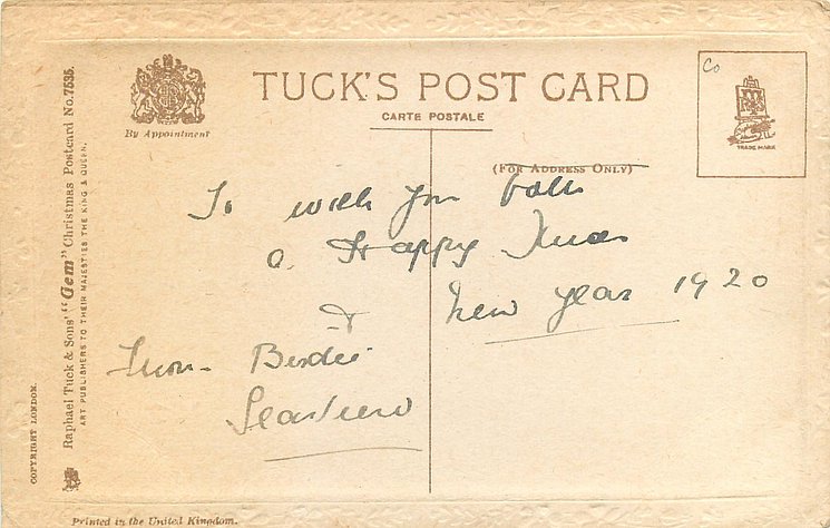 GEM, embossed borders, PRINTED IN THE UNITED KINGDOM, COPYRIGHT LONDON, come glossy but not so trade-named, same images & verses with reference to family GEM RELATION 2077, same images w/ Birthday greetings GEM BIRTHDAY 2026