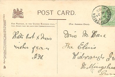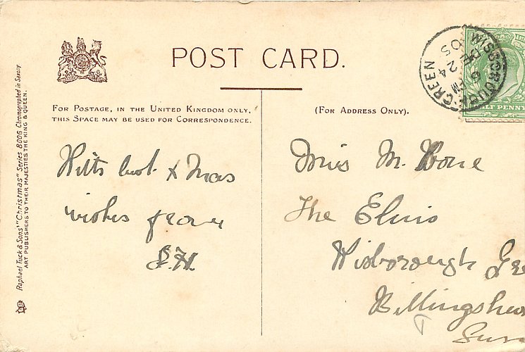OILETTE, PRINTED IN ENGLAND, COPYRIGHT LONDON, 2 backs, same images & inscriptions inset Christmas COLORED CRAYON 7665