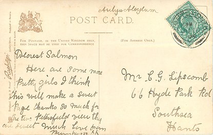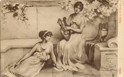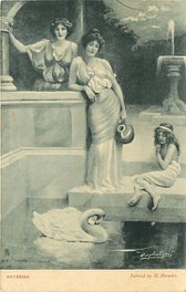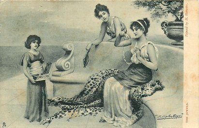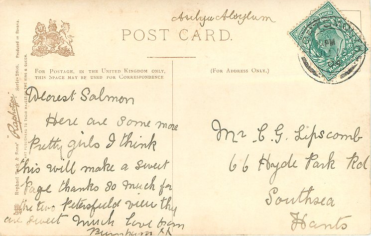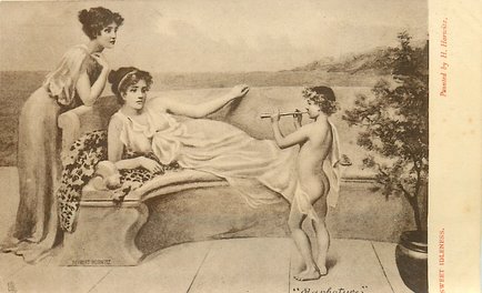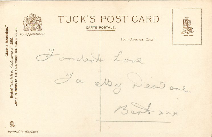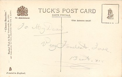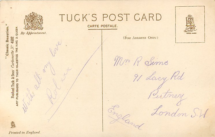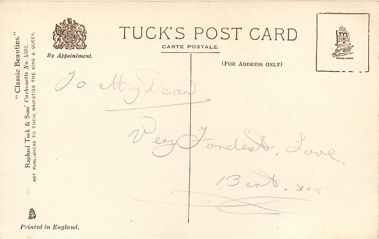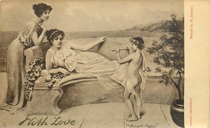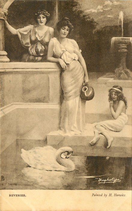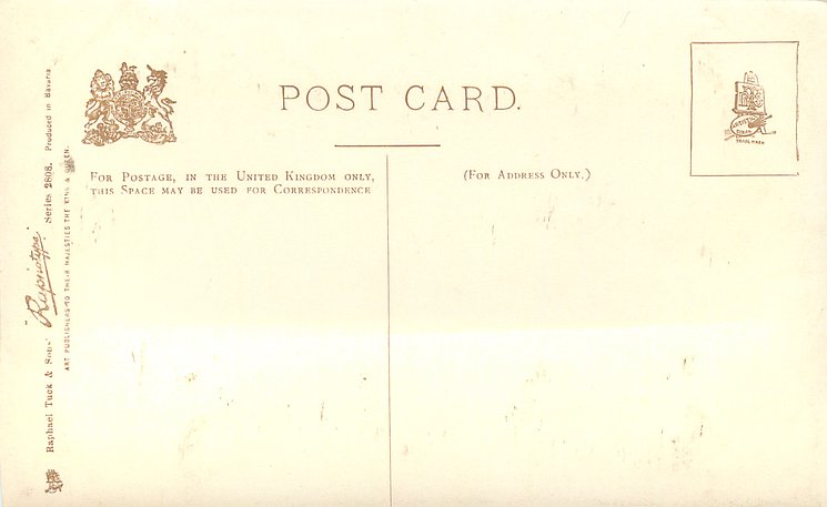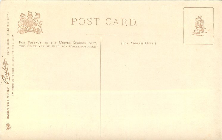 grey-green or sepia, RAPHOTYPE, 2 backs, PRODUCED or PHOTOTYPED IN BAVARIA (in stamp[ box), same images 2908, PAINTED BY H. HORWITZ., listed in 1904 POSTCARD Catalogue