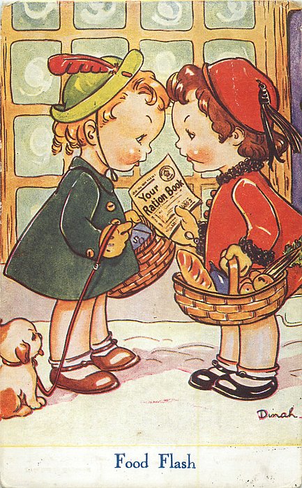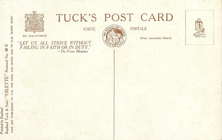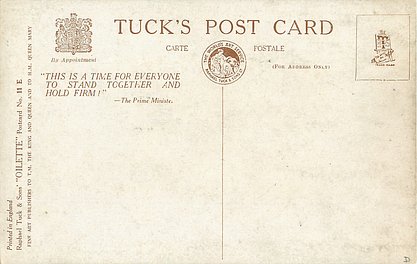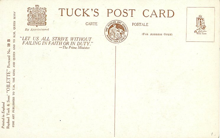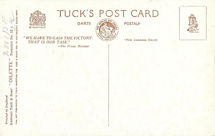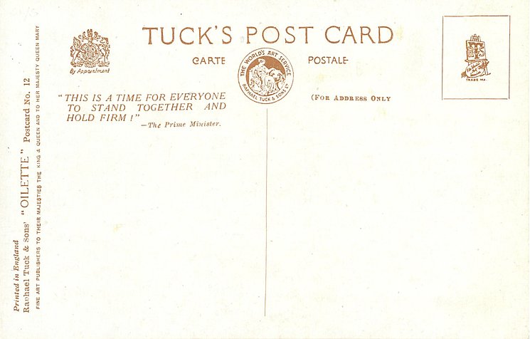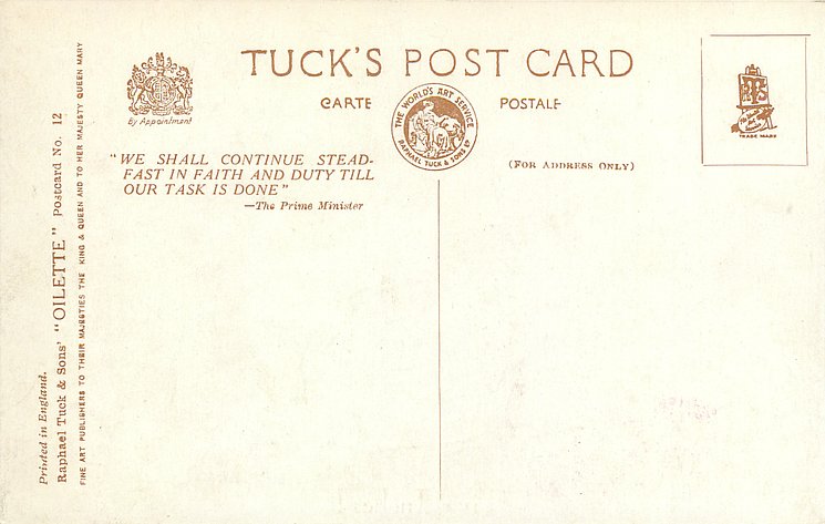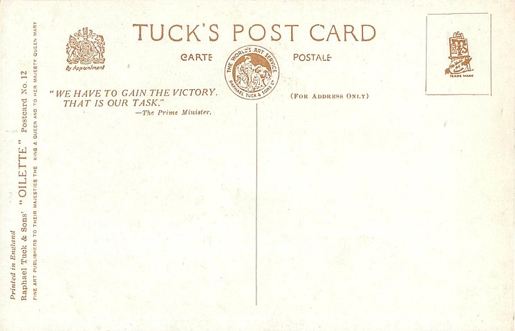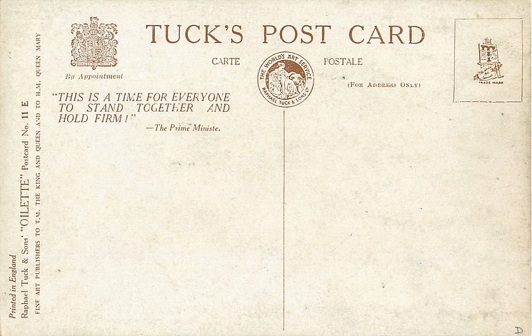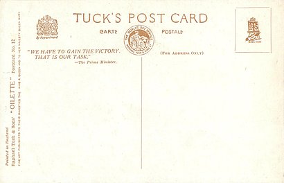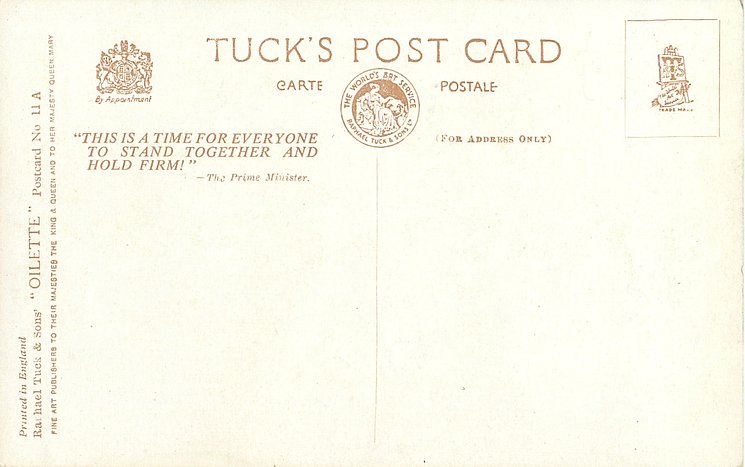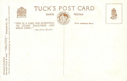 OILETTE, PRINTED IN ENGLAND, patriotic slogan on back, same image and title in set "comic children World War II period, unnumbered"