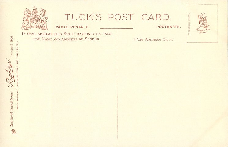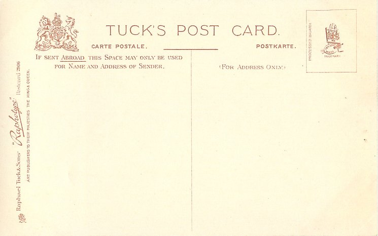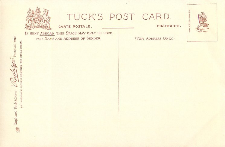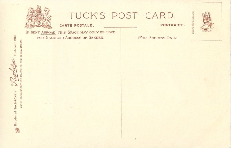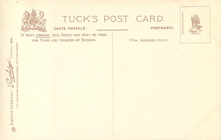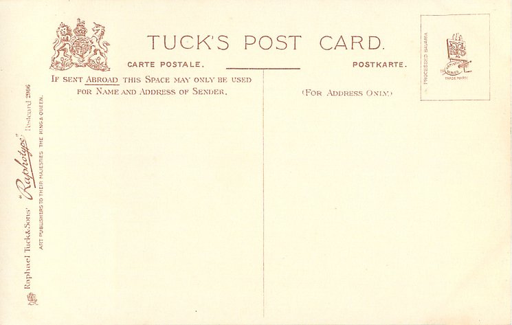 monochrome, RAPHOTYPE, PRODUCED IN BAVARIA, same images in sepia 2802, listed in 1904 POSTCARD Catalogue