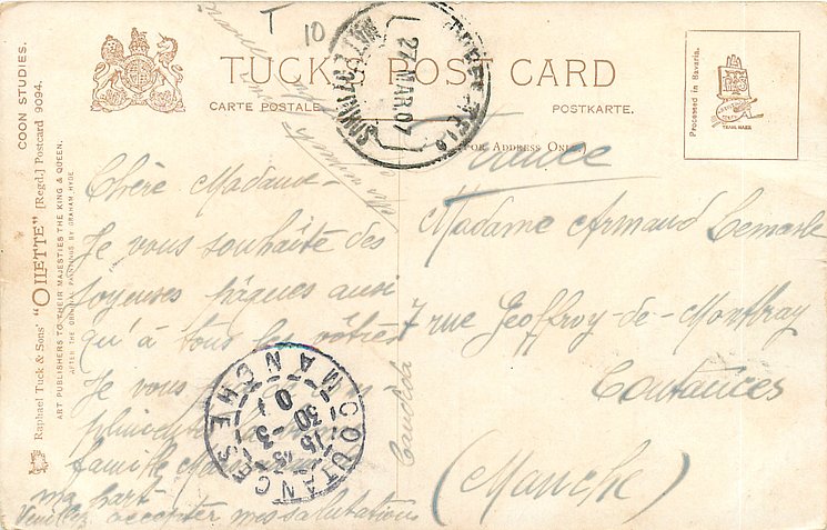 OILETTE, PROCESSED IN BAVARIA (in stamp box)OILETTE, listed in 1908/1909 & 1911/1912 & 1913/1914 Postcard Catalogues