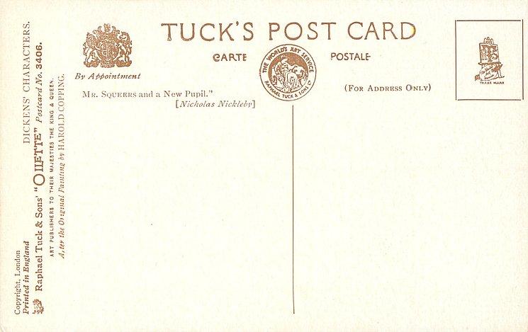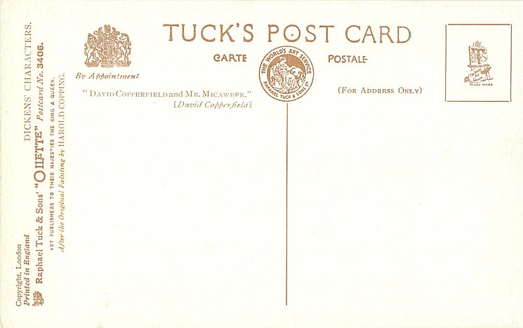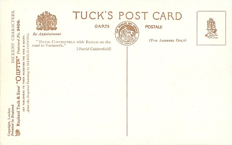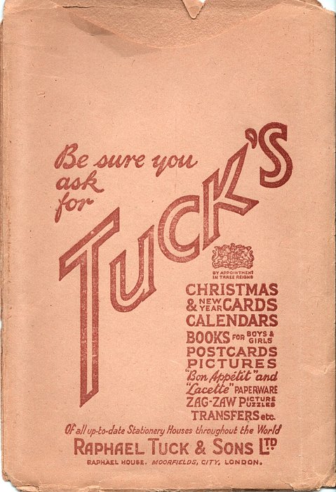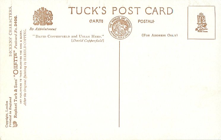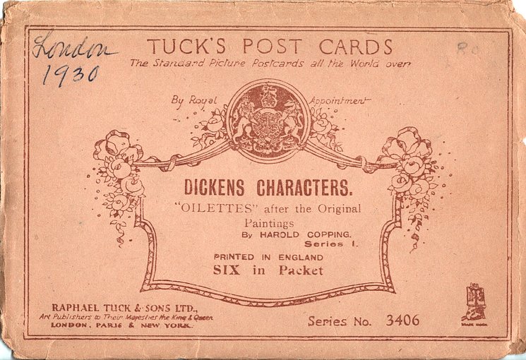 OILETTE, PRINTED IN ENGLAND, COPYRIGHT LONDON, series II on packet but not on cards, come O/F but not so trade named, AFTER THE ORIGINAL PAINTING BY HAROLD COPPING, listed in1930 POSTCARD Catalogue &1932 ART SERVICE Catalogue. Tuck number error of 8407 for 3407 occurs with reversed 3, giving appearance of 8407 for one card only