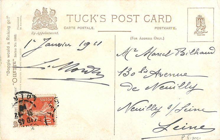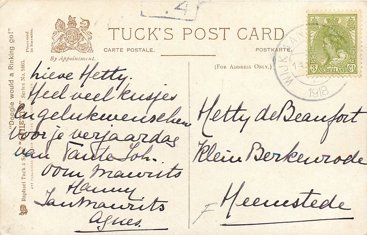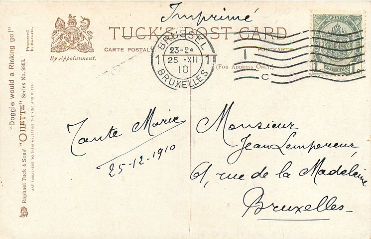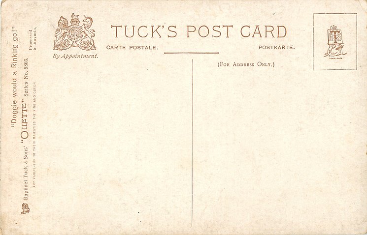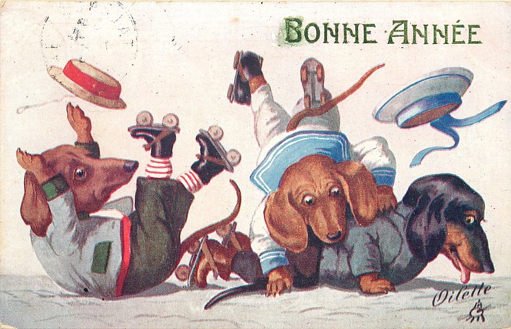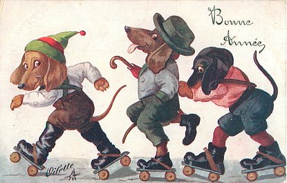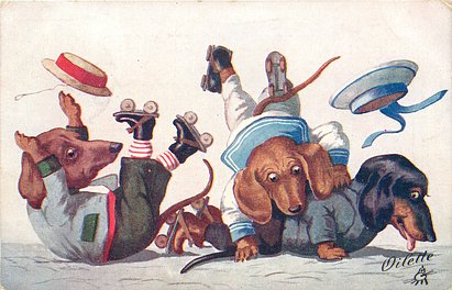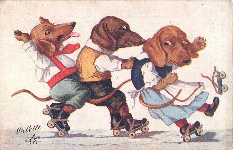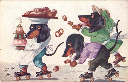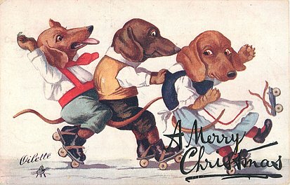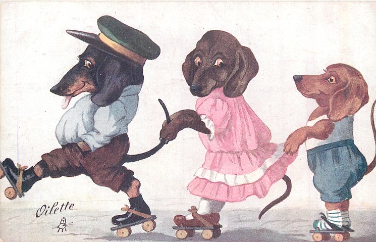 OILETTE, PROCESSED IN BAVARIA, listed as THE SKATING CARNIVAL in 1911/1912 & 1913/1914 Postcard Catalogues, same images German backs 9803 OILETTE & titled DACKEL AUF ROLLSCHUHEN